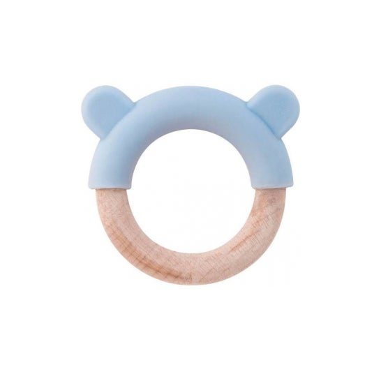 This teether combines beech wood and food-grade silicone, providing a mixed texture that stimulates the senses and promotes the child's tactile and visual development. Its ear shape and soft lines make it easy to grip, adapting to small hands.