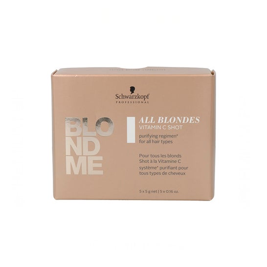Vitamin C Shots for all types of blond hair. When used in combination with Schwarzkopf Professional BlondMe detox mask, they help to remove mineral residues from water and other residues, as well as to counteract blue and green tones caused by chemical aggressions on the hair. Facilitates shiny blond hair with a healthy and luminous appearance. Contains 5 sachets of 5g each for professional use.