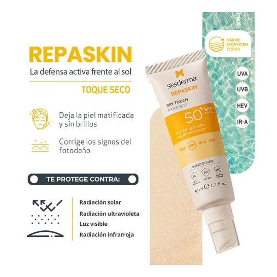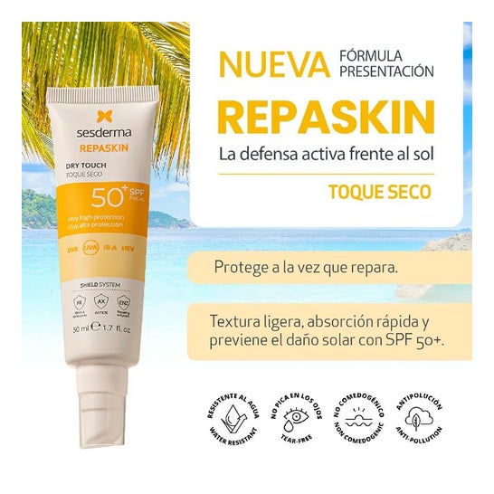 Sesderma Repaskin Facial Sunscreen Dry Touch SPF50+ 50ml is a facial sunscreen that will help you protect your skin from solar radiation, preventing photoaging.