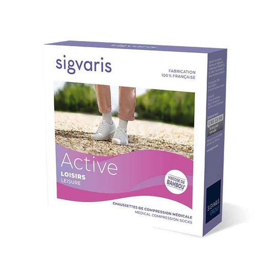 The **Sigvaris 2 Active Leisure Women's Sock Gray Long TL 1 Pair** is an ideal option for women who want to prevent and relieve venous discomfort during the day. It offers medical compression class 2 (15-20 mmHg), being effective for vascular health care. It is especially recommended to prevent mild venous insufficiency and relieve tired or swollen legs. Its long gray design is discreet and easily adapts to any active and dynamic lifestyle. This sock stands out for its graduated compression, which improves blood circulation and reduces the feeling of heaviness in the legs. Made with bamboo fibers and a patented knitting technique, it provides softness and a thermoregulating effect, ensuring comfort and freshness throughout the day. Its main benefits include relief from swelling, prevention of varicose veins, and effective support for women who spend many hours standing or sitting.