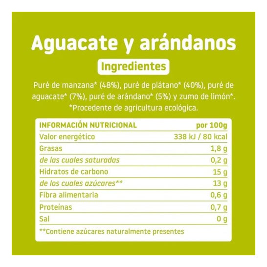 Dessert made from avocado, blueberry and apple extracts 100% from organic farming. Developed to promote digestive health of the little ones and help complementary feeding from 6 months of age. It has a drinkable texture with a pleasant creamy fruit flavor. No added sugars, preservatives or additives. Recommended for breakfast and snacks. Presented in a recyclable plastic pouch style container.