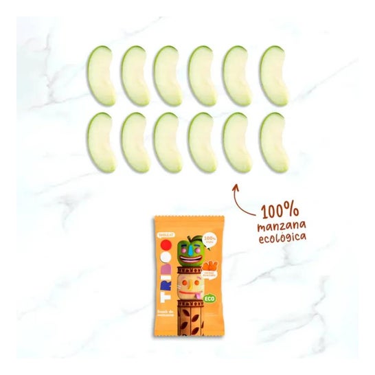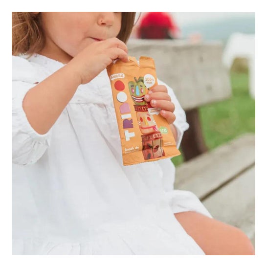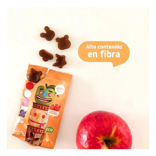 Apple-based snack for children with a texture similar to jelly beans. Contains no added sugar, sweeteners or additives. Baked in molds over low heat to preserve the nutrients of the fruit and give it a fun shape. Free of gluten, milk and eggs. Can be the ideal complement to any meal during the day.