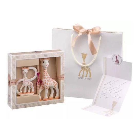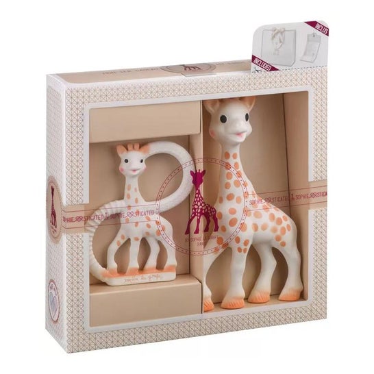 Sophie La Girafe Pack My First Teething Ring is a set for the little ones that includes a giraffe toy and its teething ring. This set helps to enhance the baby's senses. On one hand, the dark spots and bright colours help to attract the little one's attention, providing them with calmness and confidence. Additionally, it features a whistle that helps to stimulate auditory capacity. Moreover, it is made from natural rubber and food-grade paint to ensure it is safe for the baby's biting and to relieve the pain of teething.