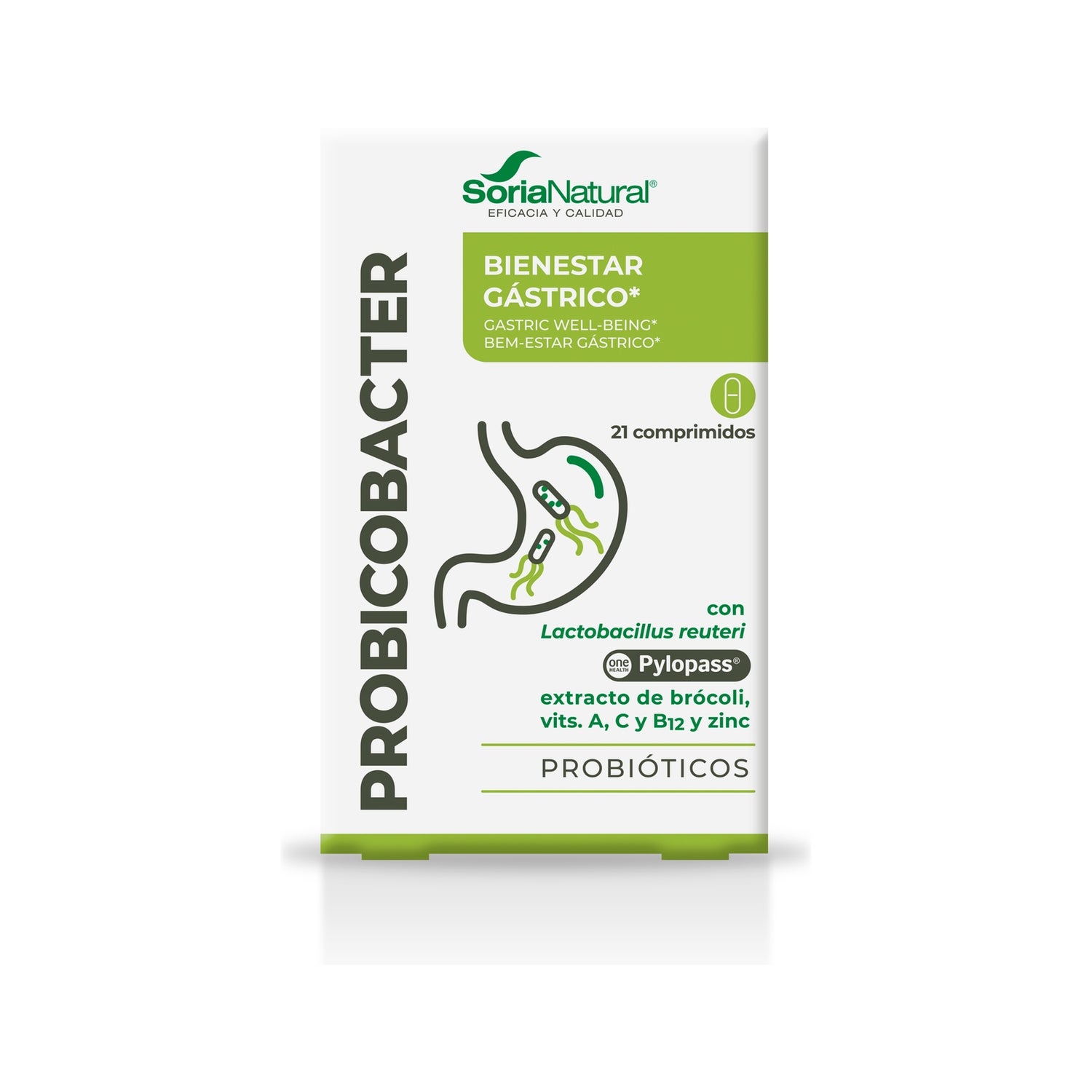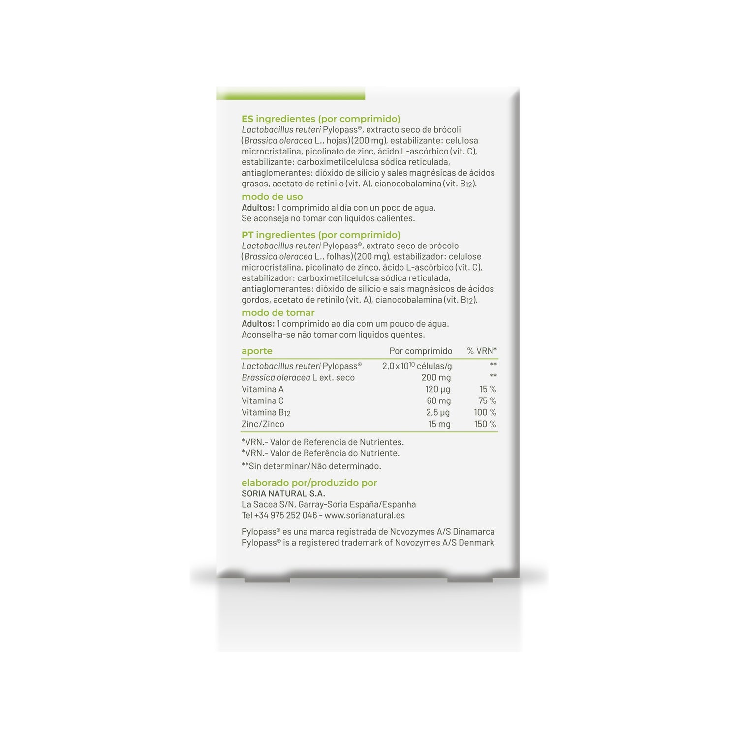 Dietary supplement designed to help eliminate Helicobacter pylori. Specific probiotic that acts coaggregated with Helicobacter pylori and facilitating its expulsion from the body; also contains dry extract of broccoli, vitamins and minerals that reinforce the action of the probiotic, promote regeneration and healing of the gastrointestinal epithelium and provide an extra supply of these nutrients to the body.