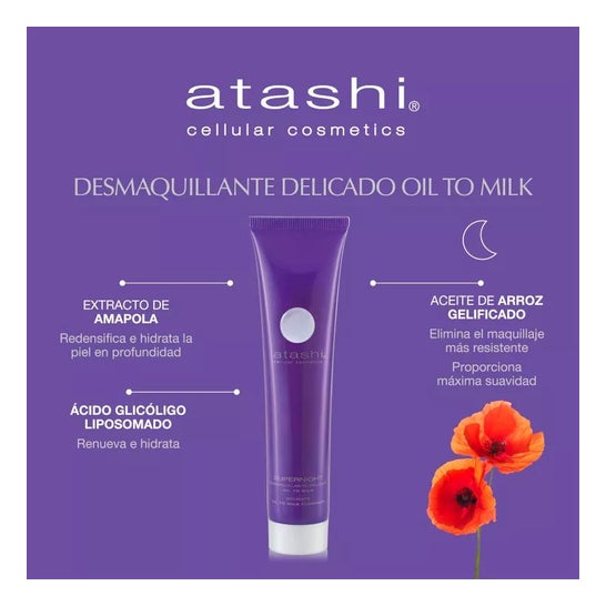 Supernight Oil To Milk Makeup Remover 50ml is a soft textured makeup remover that cleanses makeup and impurities from the face, treating the skin in depth. Leaves skin purified and free of impurities. It also provides the face with adequate moisture and protects from blue light. Formulated with rice oil, poppy extract and AHA.