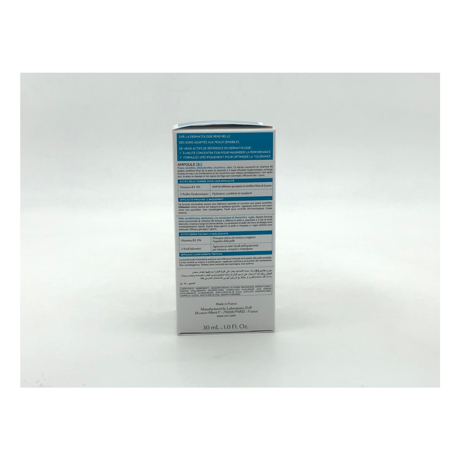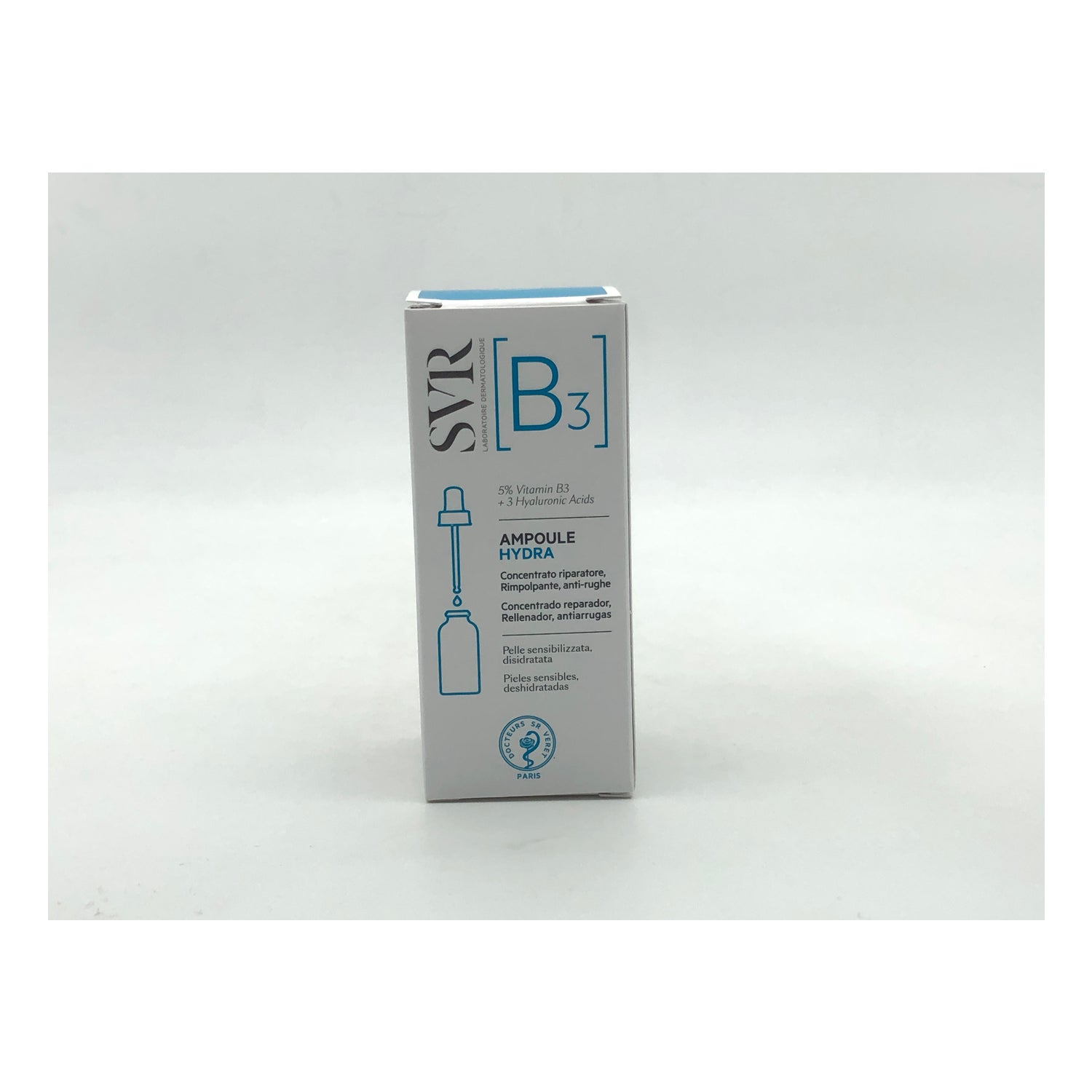 Concentrated moisturising serum that contributes to skin repair. Based on vitamin B3 and 3 hyaluronic acids of different molecular weights. Helps soothe and strengthen sensitive, very dry, wrinkled and stressed skin. Helps to retain skin moisture. Anti-aging action. Non-comedogenic. Made under dermatological control. Made in France.
