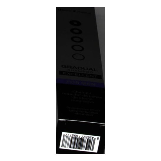 Shampoo for men with grey hair reduction effect. Neutral pH formula. Helps to attenuate gray hair gradually with each application while moisturising and caring for the hair. Its components exert a subtle, discreet and natural-looking action that improves its effectiveness with each use. Packaged in a 100% recyclable aluminum tube. Suitable for frequent use by people over 18 years old.