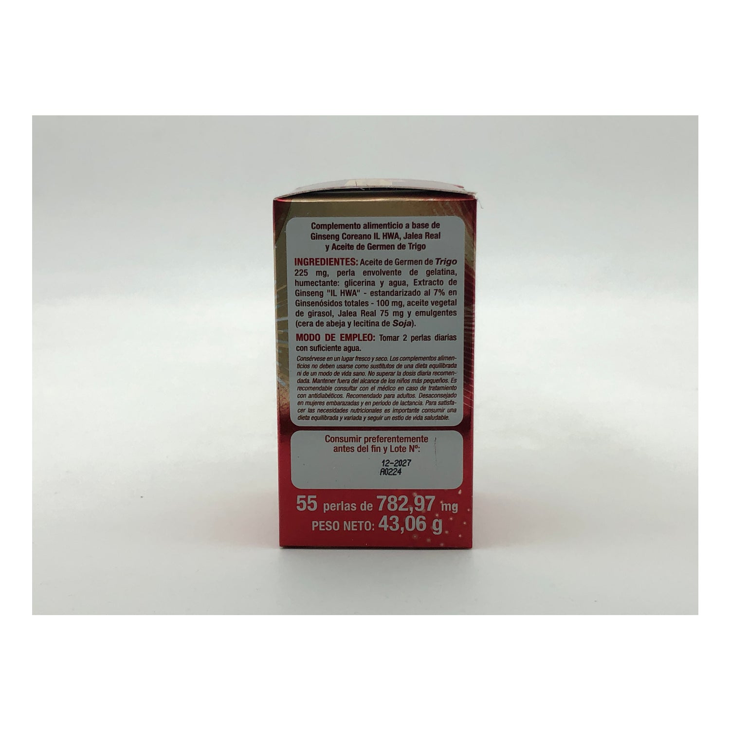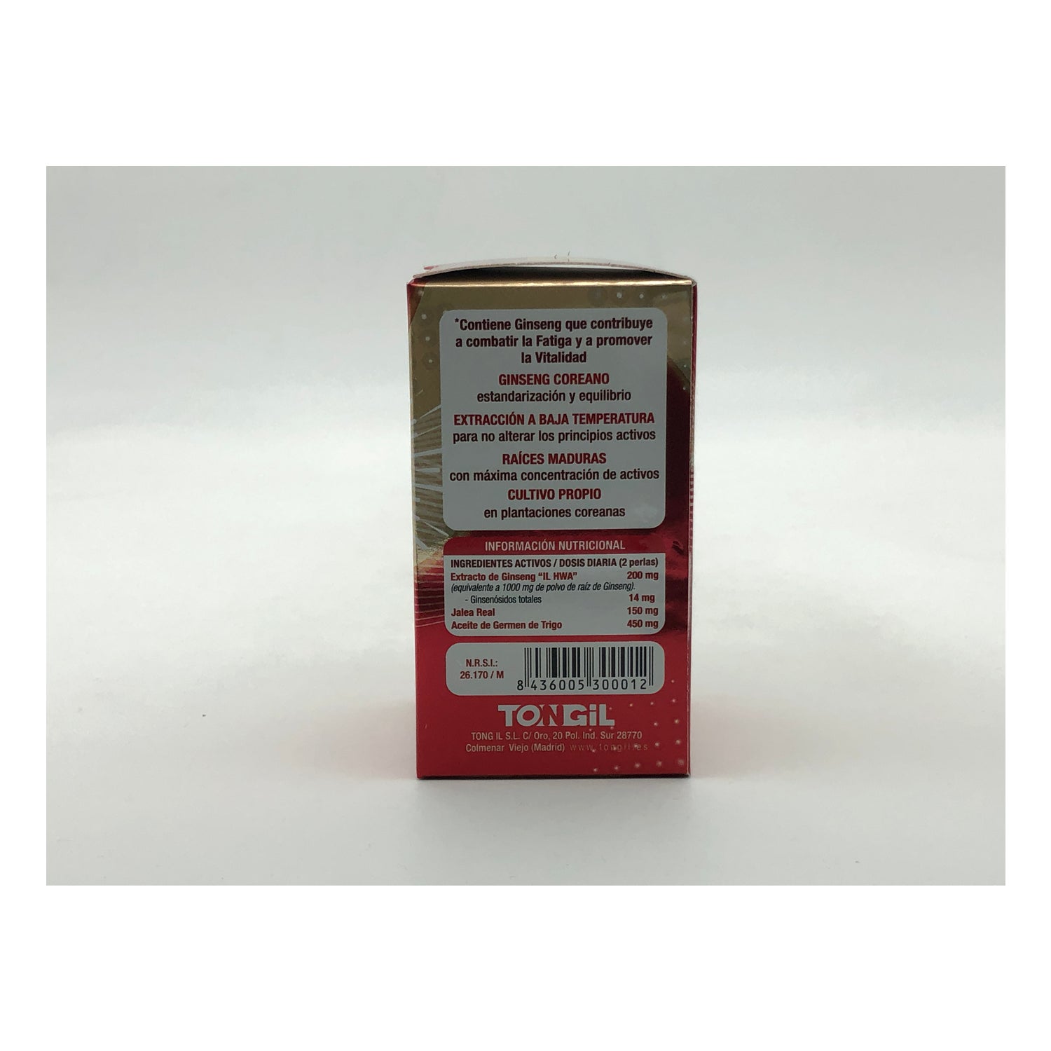 A food supplement based on dry extract of whole root of 6-year-old Korean Ginseng IL HWA 5:1 (Panax ginseng C.A Meyer), Royal Jelly and wheat germ oil. Contributes to natural defences and the proper functioning of the immune system and to the maintenance of normal blood glucose levels. Helps maintain good cognitive performance and promote alertness. Contributes to memory performance and helps maintain good sexual relations. Helps counter fatigue and promotes vitality.