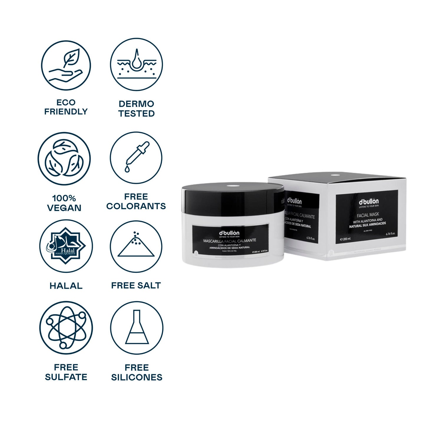 Soothing facial mask with Allantoin and natural silk amino acids. Light and fresh with a calming effect (Allantoin), relaxing and highly moisturizing, due to the 100% natural silk amino acids it contains, we present this facial mask from the Válquer brand, which removes impurities, decongests the skin, and provides excellent softness and texture.