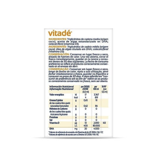 Vitadé Vitamin D3 is a food supplement that combines DHA (docosahexaenoic acid) with vitamin D, ensuring the supply of these nutrients in our body according to daily needs.