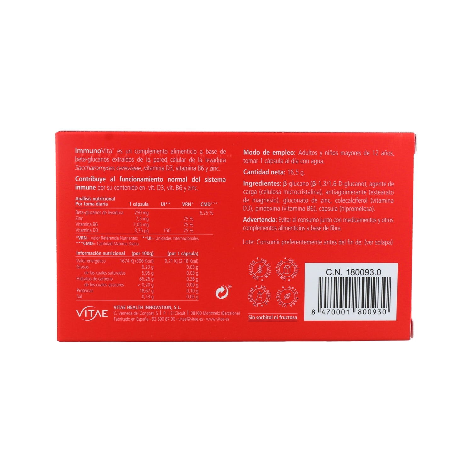 Vitae Immunovita 30caps is a food supplement with beta-glucans purified from Saccharomyces cerevisiae yeast, vitamin D3, vitamin B6 and zinc.