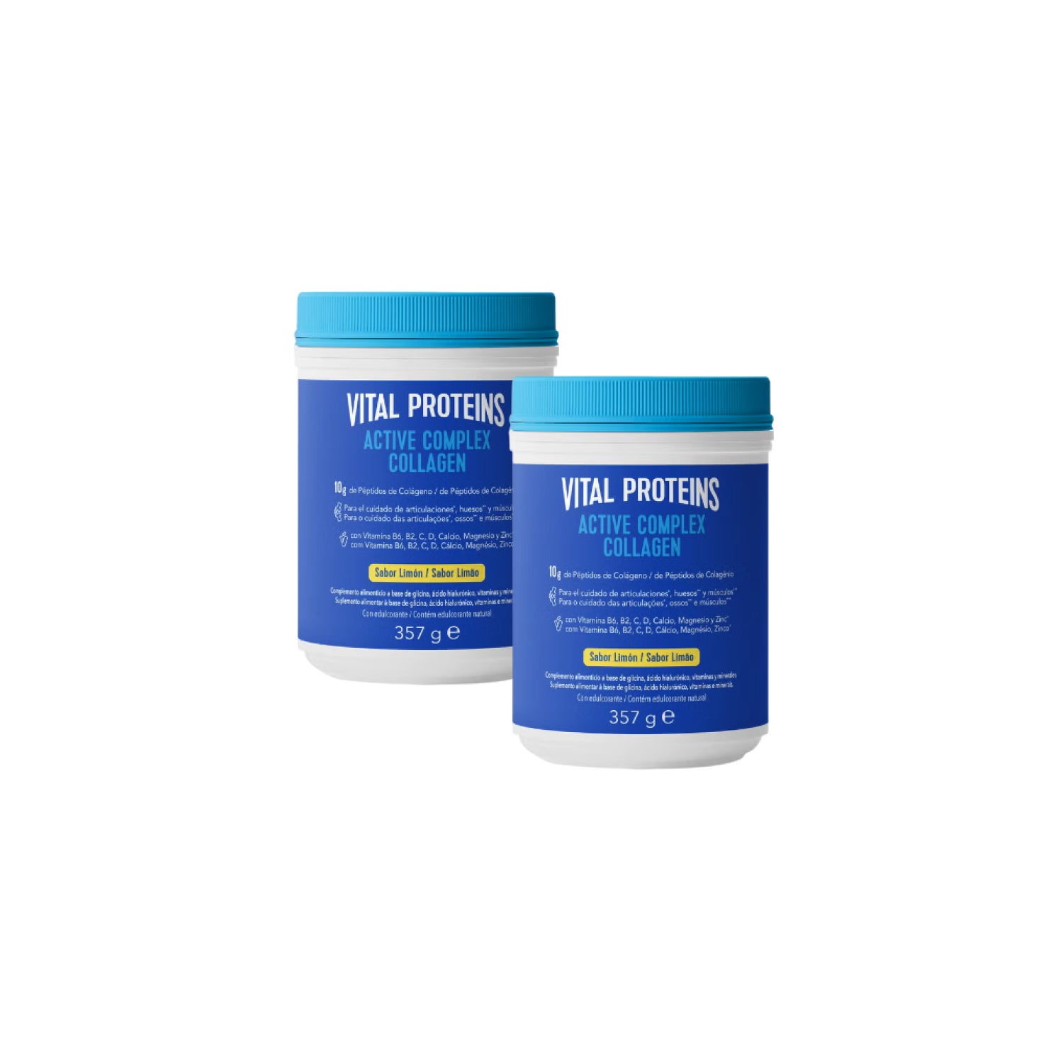 Vital Proteins Pack Active Complex Collagen Lemon 2x357g is composed of collagen peptides, calcium, magnesium, zinc, riboflavin, vitamin B6, C, D, hyaluronic acid, and glycine.