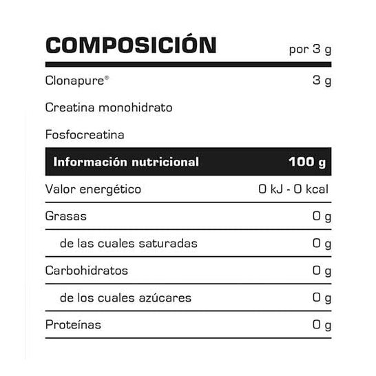 Powdered dietary supplement, formulated with creatine to support physical performance. With an active ingredient clonapure®, which provides energy to the muscles quickly. Contains creatine monohydrate, phosphocreatine and phosphate that contribute to keep the muscular phosphagen system working longer. Helps to improve muscular capacities in strength and explosive sports. Collaborates in the faster regeneration of ATP.