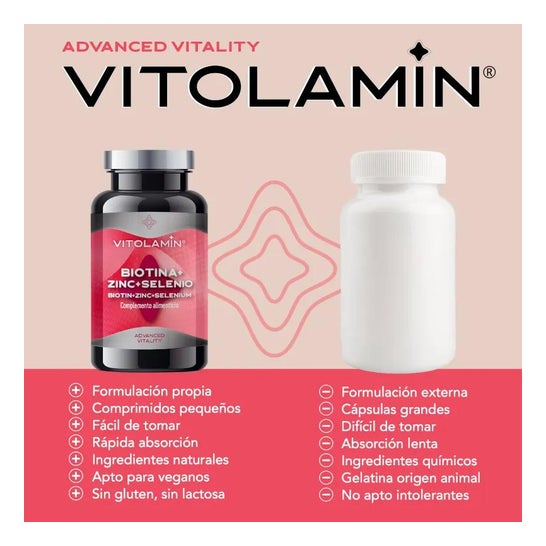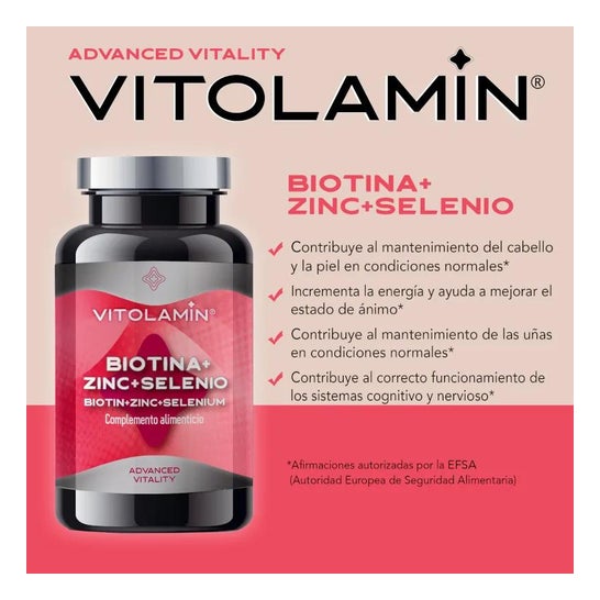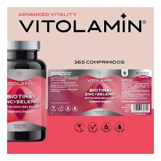 Vitolamin Biotin + Zin + Selenium 365comp is a food supplement containing biotin, zinc and selenium.