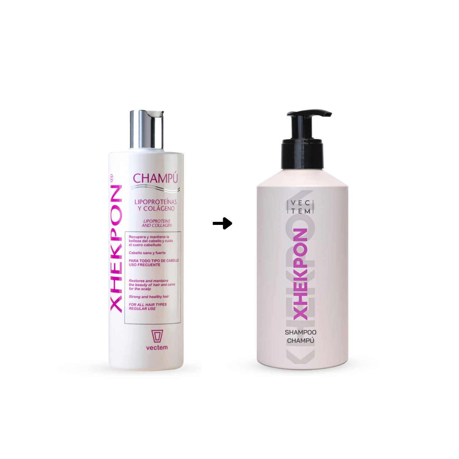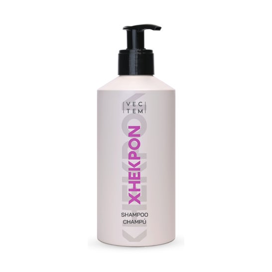 Lipoproteins and collagen shampoo Xhekpon, hair cosmetics product, designed to facilitate a rich capillary nutrition while sanitising the hair. The composition helps prevent hair loss, revitalises damaged hair, gives shine and softness, repairs ends and normalises hair. In addition, it penetrates the scalp and repairs the hair, respecting the hair fibre. After use, it forms a barrier against aggressions such as styling, colour. Suitable for all hair types.