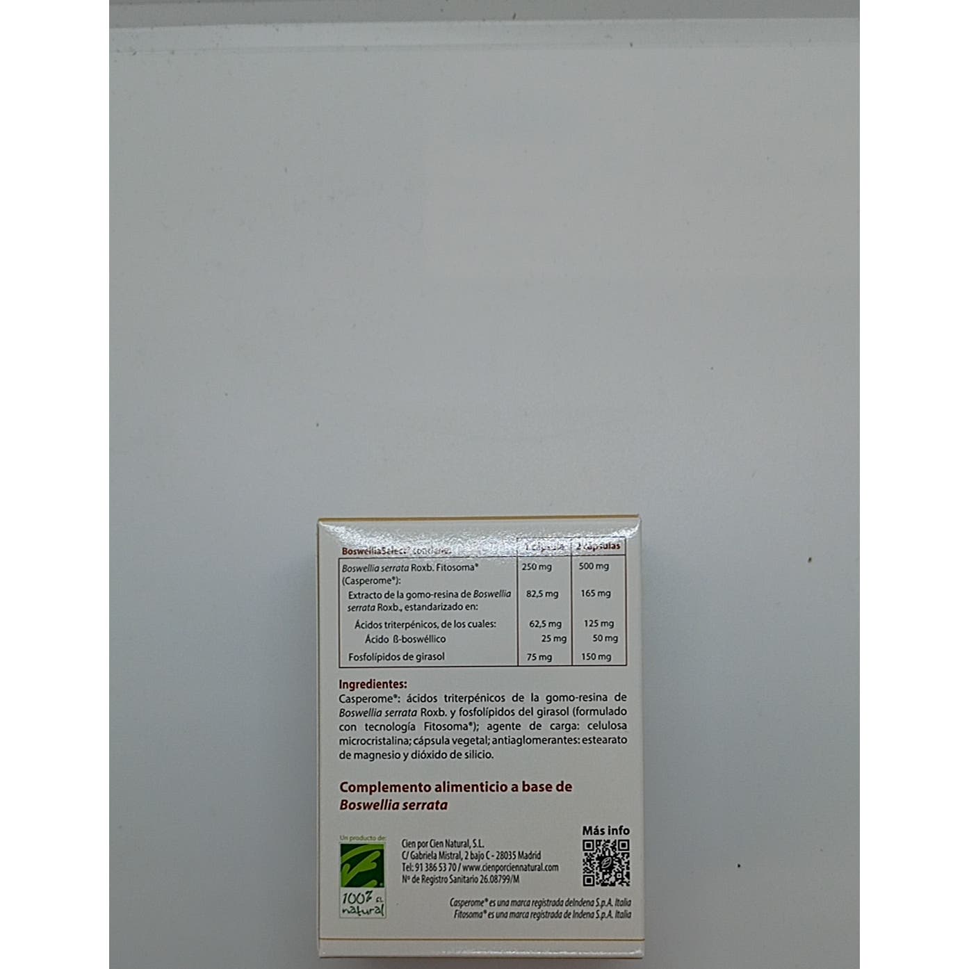100% Natural Boswellia Select está estandarizado a >25% de ácidos triterpénicos. La sinergia entre los distintos compuestos es necesaria para su efectividad, siendo el ácido β-boswélico el que juega el papel más importante.