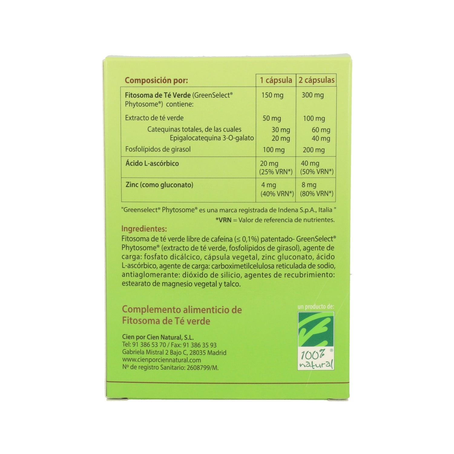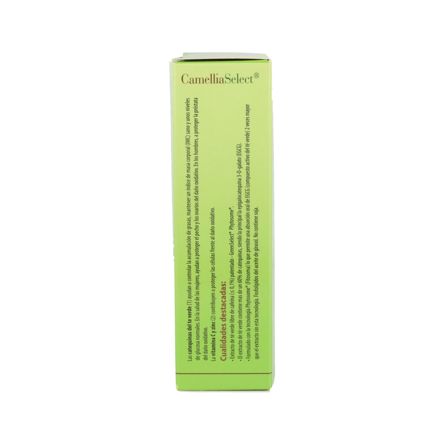 100% Natural Camellia Select Antioxidante es un extracto seco de hojas jóvenes de té verde descafeinadas (<0,01% cafeína) y formulado con la tecnología Phytosome® (Fitosoma), la cual mejora la biodisponibilidad y eficacia del extracto, consiguiendo una absorción de hasta 2 veces mayor en el organismo.