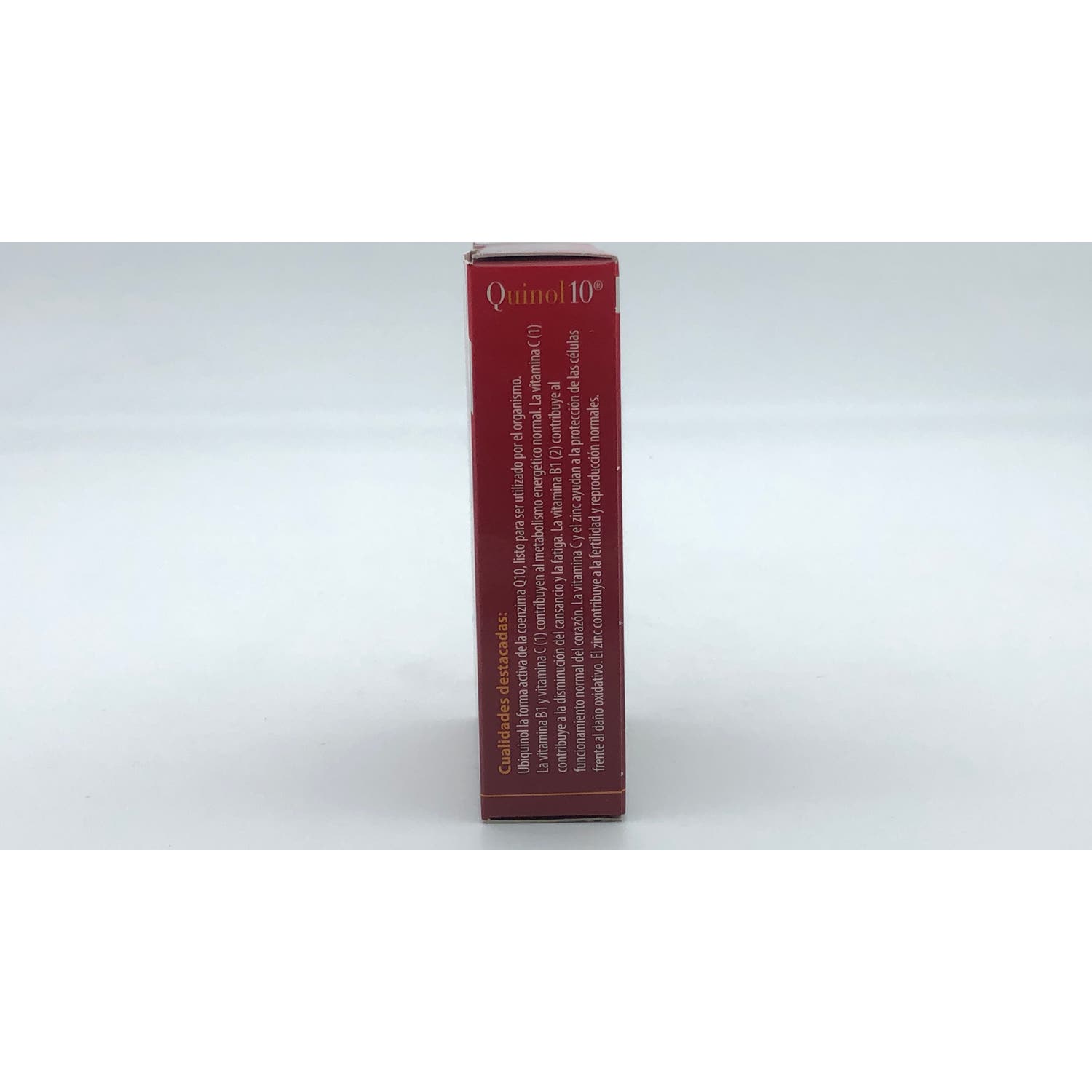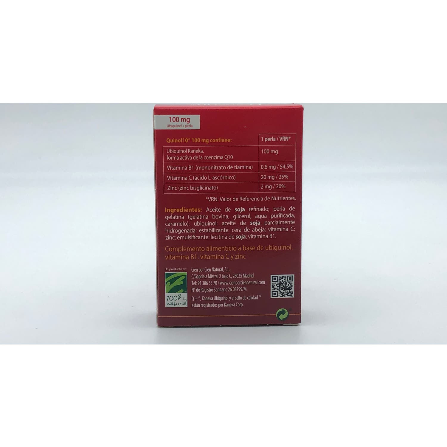 100% Natural Quinol10 es un complemento alimenticio en formato de 30 cápsulas de 100 mg que proporciona energía al cuerpo y favorece el correcto funcionamiento del corazón. Contiene Ubiquinol, la forma activa de la coenzima Q10, lista para ser utilizada por el organismo. Además, se enriquece con vitamina B1, B3 y Zinc.