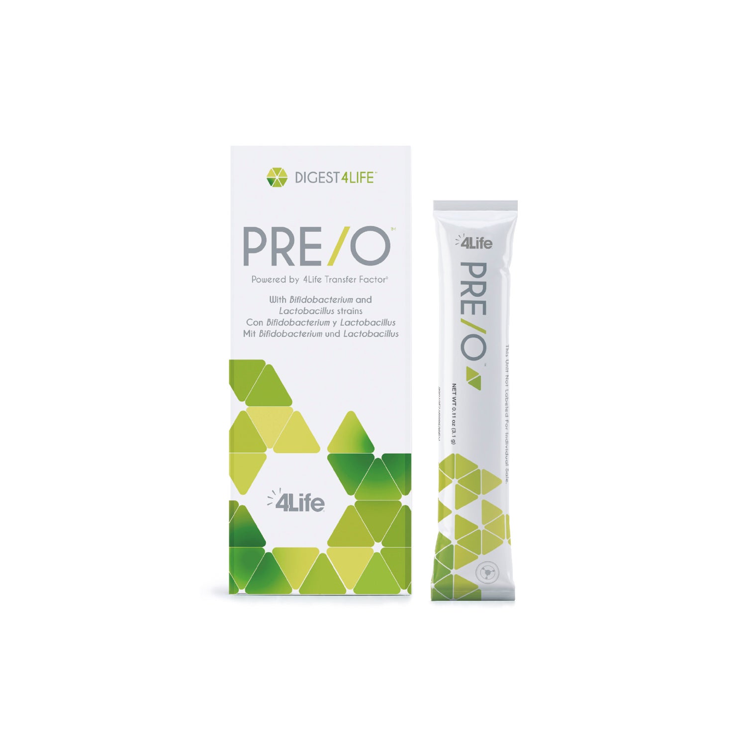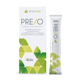 4Life Digest4Life Pre/O es un suplemento presentado en saquetas prácticas, que contiene 1000 millones de cultivos vivos de cinco cepas diferentes, así como fibras y oligossacaridos, diseñados para ayudar a restaurar el equilibrio de la microbiota intestinal.
