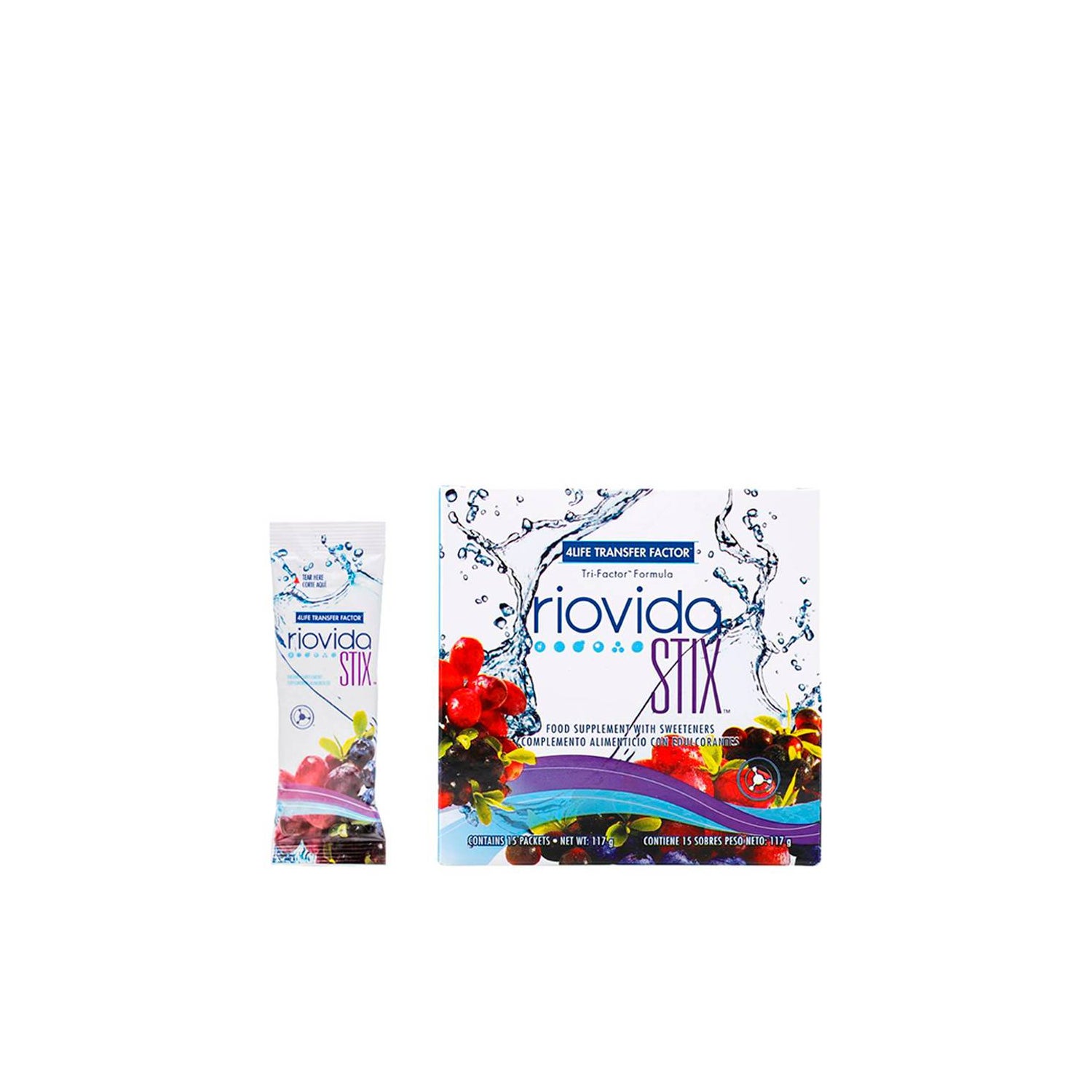 4Life Transfer Factor RioVida Stix 15 Saquetas es un suplemento dietético que incorpora edulcorantes, minerales y la exclusiva fórmula Tri-Factor de 4Life. Cada saqueta proporciona 600 mg de Transfer Factor, que contribuye al bienestar general.