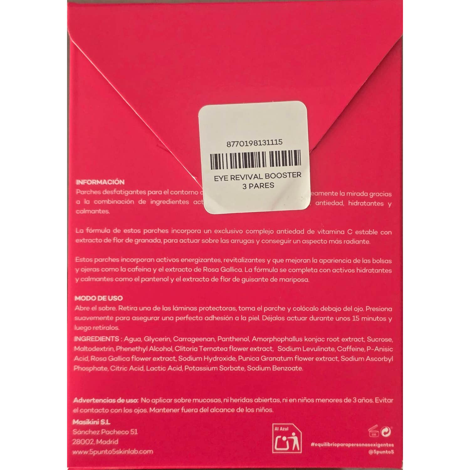 5Punto5 Eye Revival Booster 3 Pares es la solución ideal para revitalizar tu mirada de forma inmediata. Estos parches para los ojos están diseñados para proporcionar un efecto revitalizante y desfatigante mediante una combinación eficaz de ingredientes activos que trabajan en conjunto.