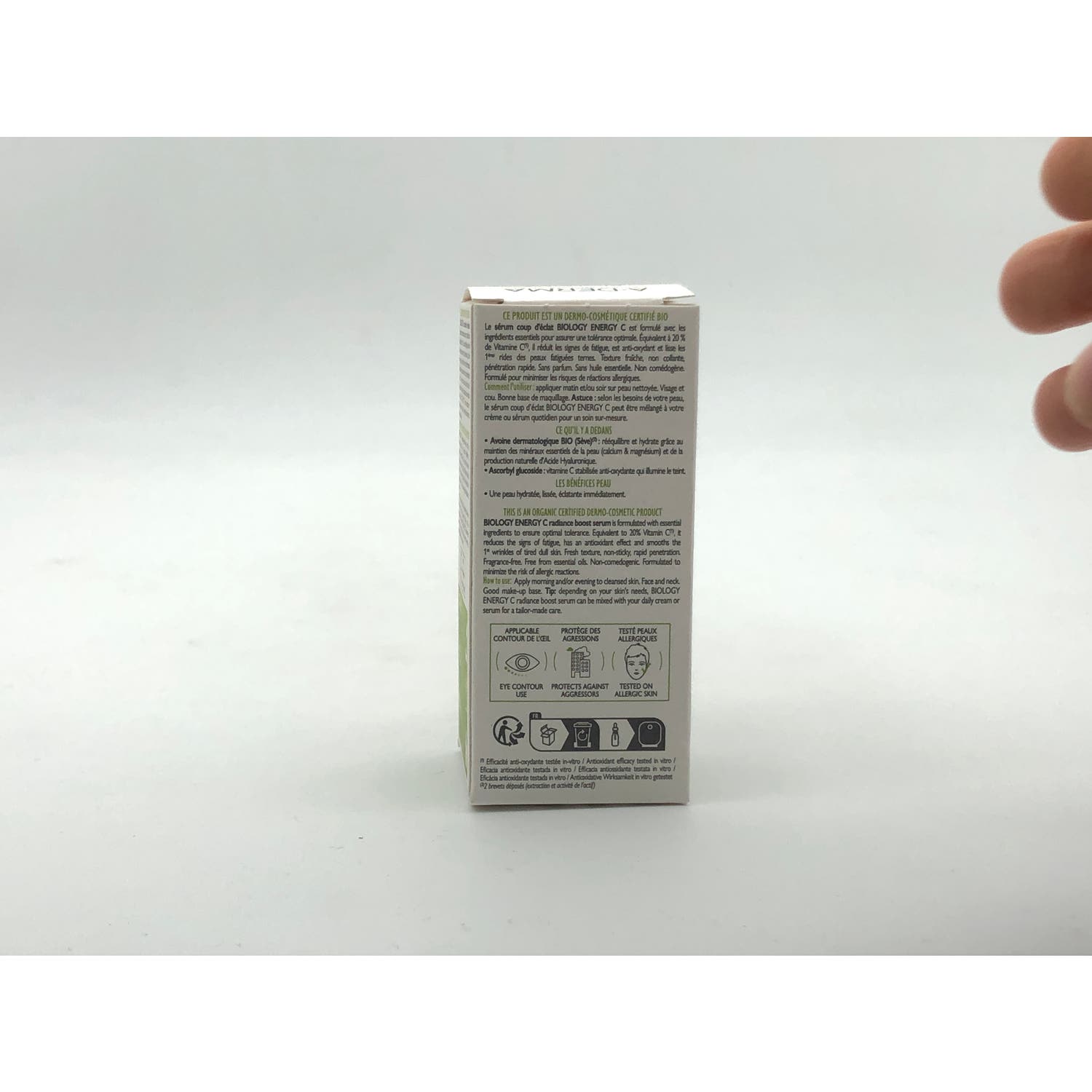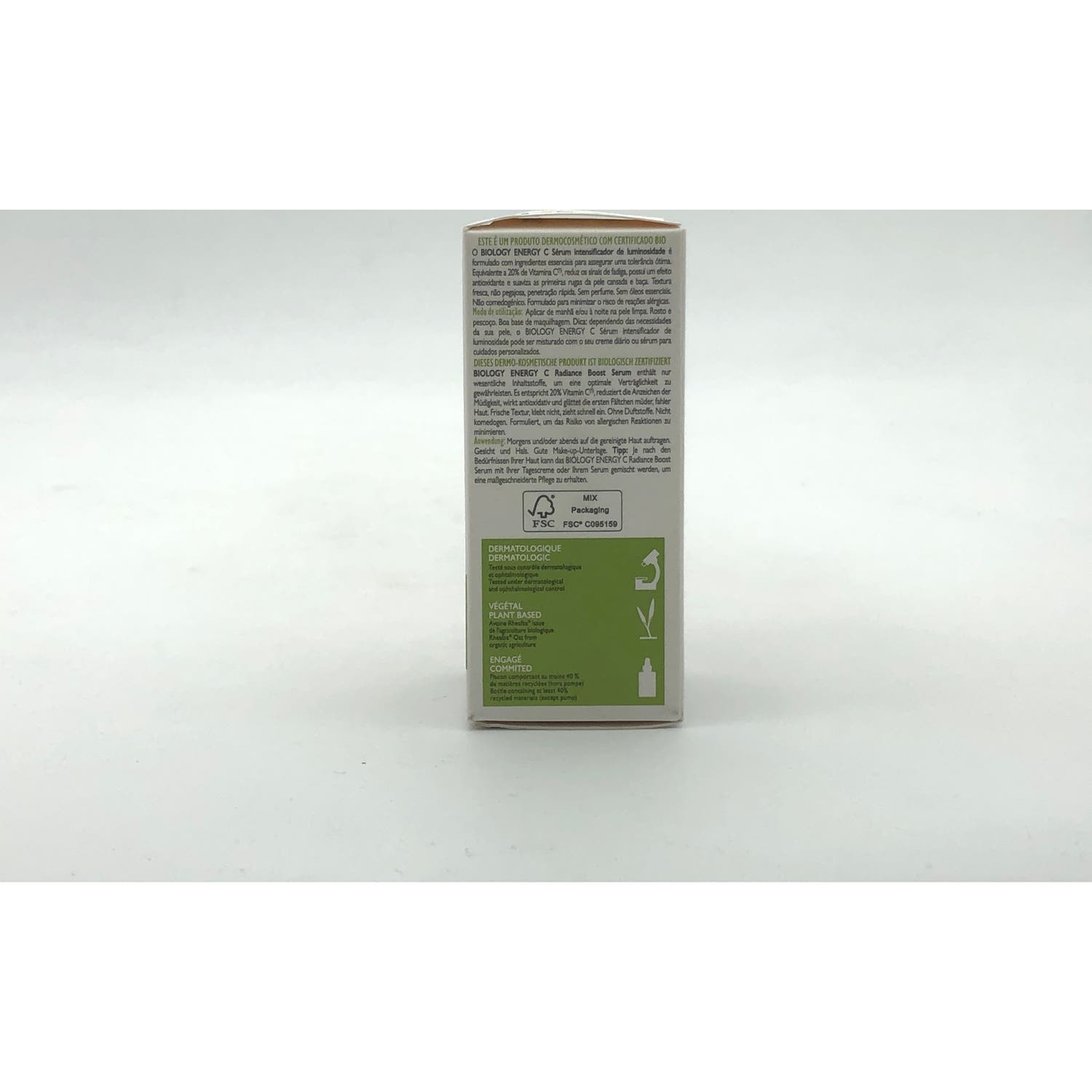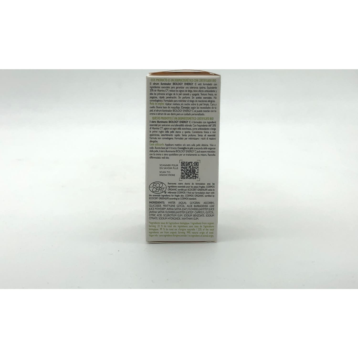 BIOLOGY ENERGY C Sérum iluminador equivalente al 20 % de vitamina C² es un sérum dermatológico innovador, con certificado ecológico. Su textura de gel fresco y no pegajoso reduce los signos de fatiga, desintoxica y alisa la piel apagada y cansada del rostro gracias a sus potentes activos: savia de Avena Rhealba®, con propiedades reequilibrantes e hidratantes, ascorbil glucósido o vitamina C antioxidante estabilizada, que ilumina la tez. Probada en pieles alérgicas, sin perfume, sin aceites esenciales y no comedogénica, su fórmula de origen 99 % natural está formulada con ingredientes esenciales para garantizar una tolerancia óptima. El sérum BIOLOGY ENERGY C con Vitamina C estabilizada puede aplicarse en el rostro, el cuello y el contorno de los ojos. Dependiendo de las necesidades de tu piel, puede mezclarse con tu rutina diaria de cuidado de la piel para obtener una rutina a medida. La piel está inmediatamente hidratada, alisada y radiante. Avena Rhealba® procedente de la agricultura ecológica. Información vegana: sin ingredientes de origen animal.