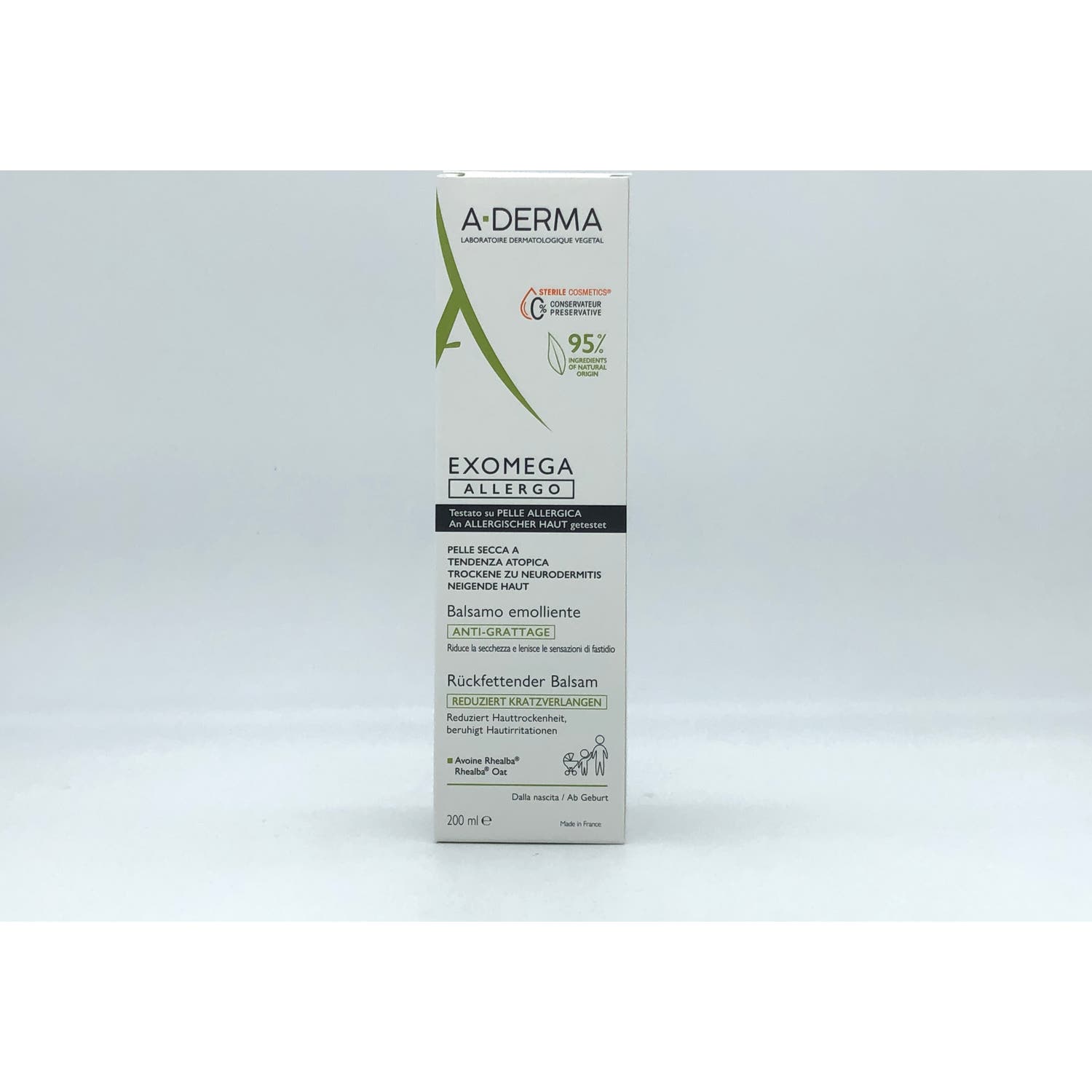 A-Derma Exomega Allergo Bálsamo Emoliente Anti-Rascado 200ml es un bálsamo que contribuye a aliviar la sequedad cutánea, así como las rojeces y la irritación de pieles secas con tendencia al eccema atópico.