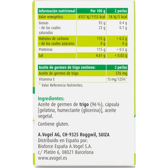 A. Vogel Aceite de Germen de Trigo 120 perlas se obtiene por presión en frío del germen de trigo integral y es rico en vitamina E, de alto poder antioxidante. Entre sus propiedades destacan que estimula funciones del sistema muscular y ayuda en situaciones de embarazo y menopausia.