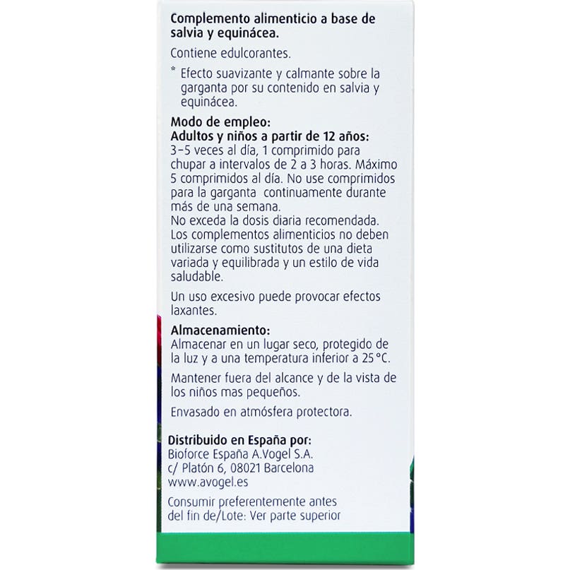 Comprimidos para chupar sin azúcar. Efecto suavizante y calmante sobre la garganta por su contenido en salvia y equinácea.
