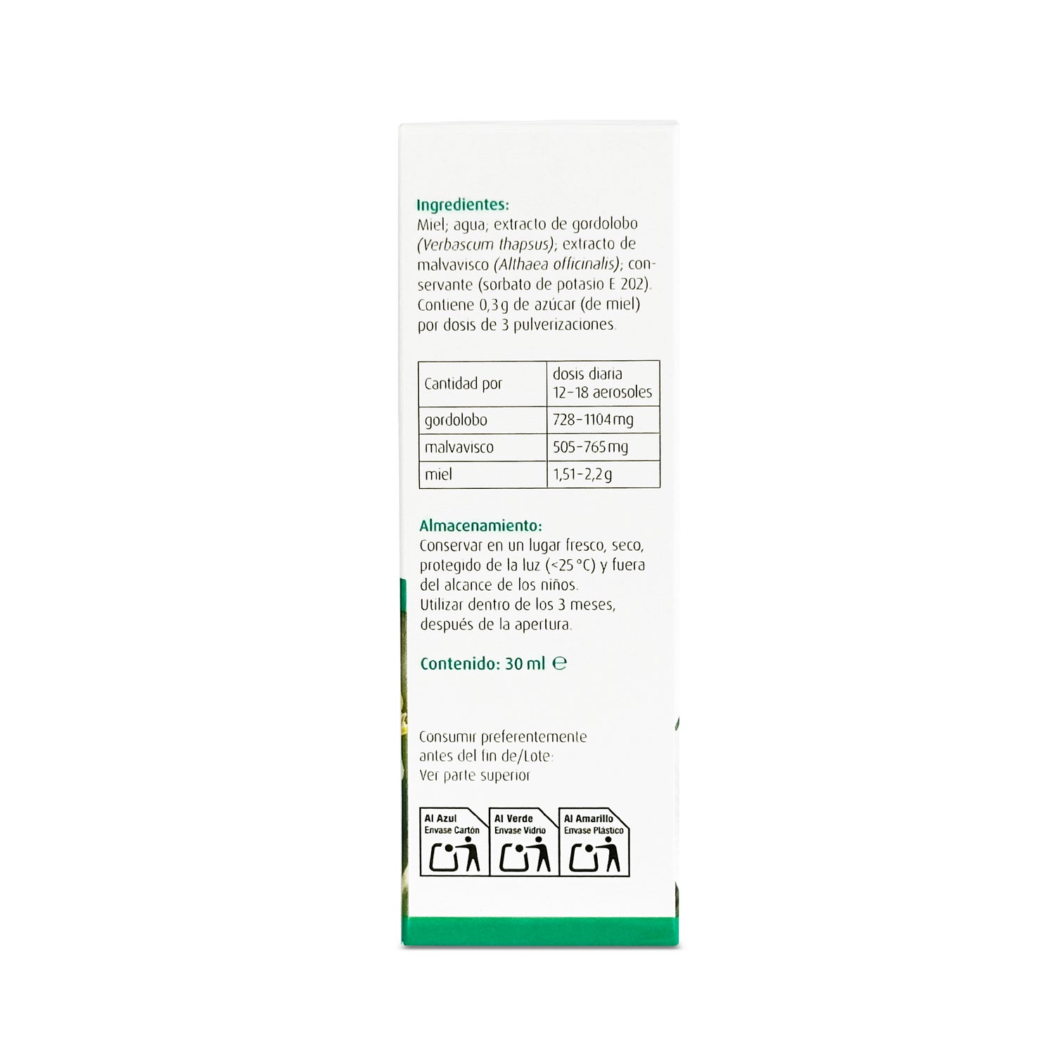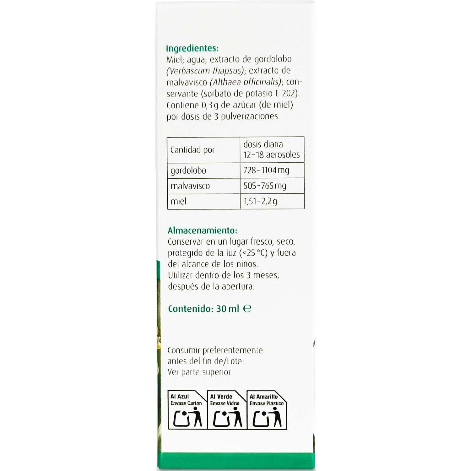 Contiene 0,3g de azúcar (de miel) por dosis de 3 pulverizaciones.
