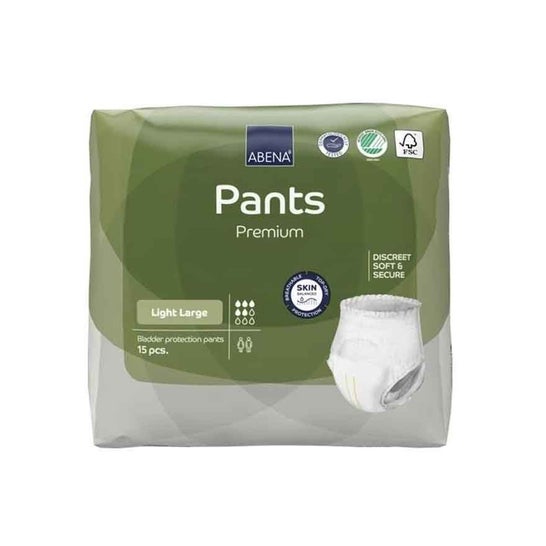 Abena Pants Premium Pañales Absorbentes Light Talla L 15uds son ideales para la incontinencia urinaria leve, ofreciendo una protección eficaz y discreta para adultos. Su diseño tipo ropa interior y ajuste seguro garantizan comodidad y libertad de movimiento, perfectos para el manejo diario de pérdidas leves de orina.