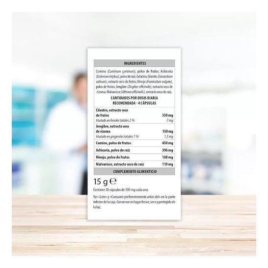 Está formulado a base de extractos naturales de gran pureza de cilantro, jengibre e hinojo, entre otros, que contribuyen a facilitar la digestión y el Jengibre que, junto con el Comino y la Achicoria, que favorecen la motilidad gastrointestinal normal y la digestión.
