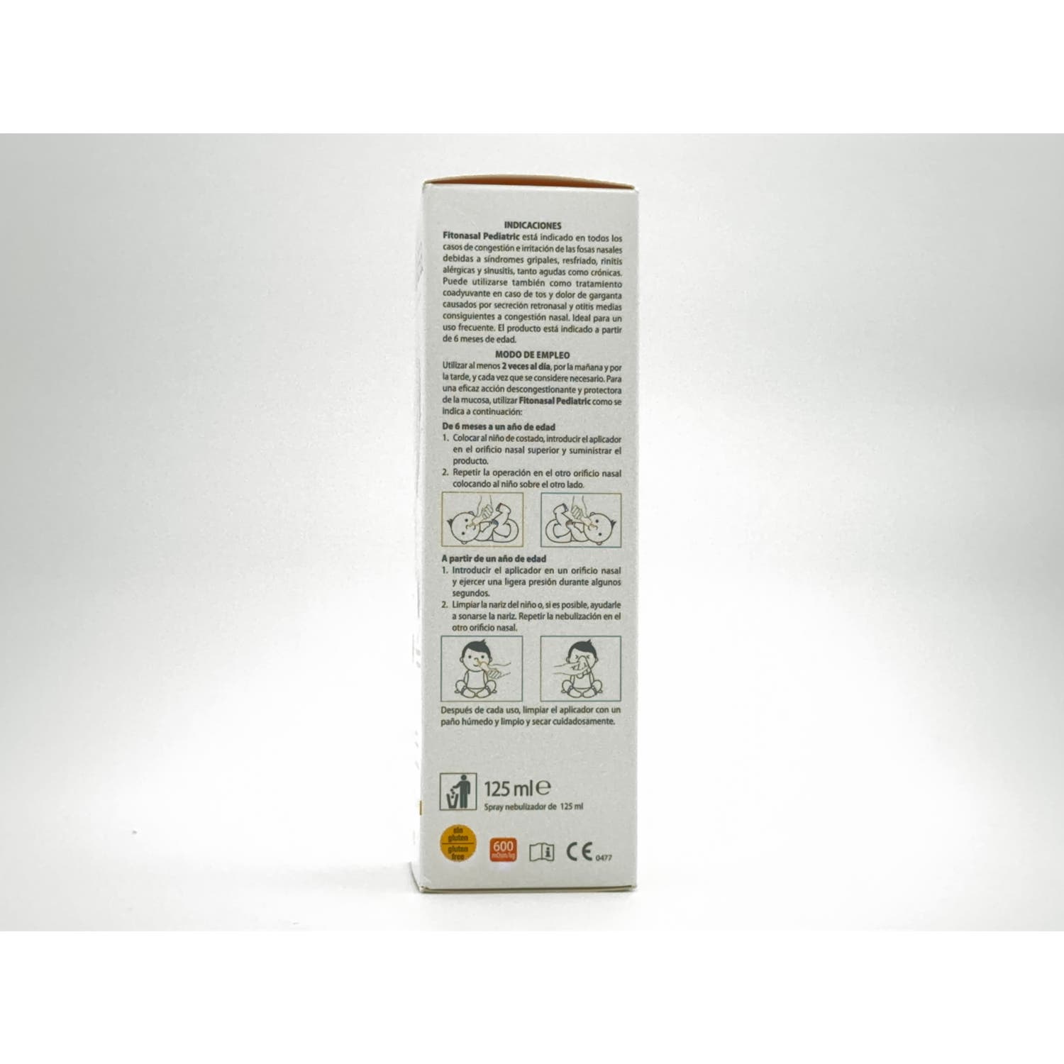 Niños de más de 1 año de edad: Efectuar la limpieza con el niño sentado en una posición cómoda. Insertar el aerosol nebulizador en la fosa nasal y presionar ligeramente durante unos segundos. Limpiar la nariz con un pañuelo, o si es posible, ayudar al niño a sonarse por sí mismo. Repetir el rociado en la otra fosa nasal.