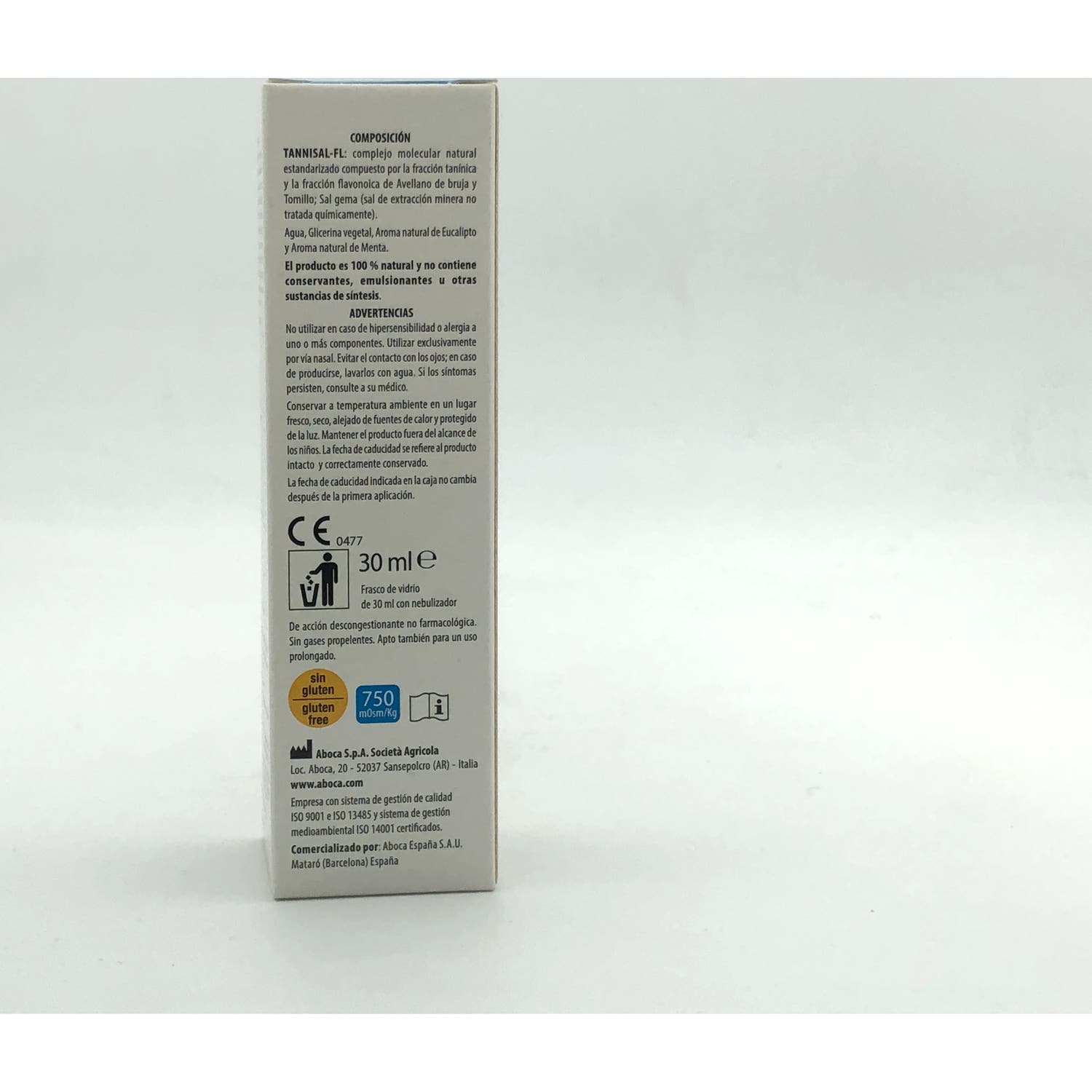 TANNISAL-FL (complejo molecular estandarizado compuesto por la fracción tanínica y la fracción flavonoica de Avellano de bruja y Tomillo; Sal gema (sal de extracción minera no tratada químicamente). Agua, Glicerina vegetal, Aroma natural de Eucalipto y Aroma natural de Menta.
