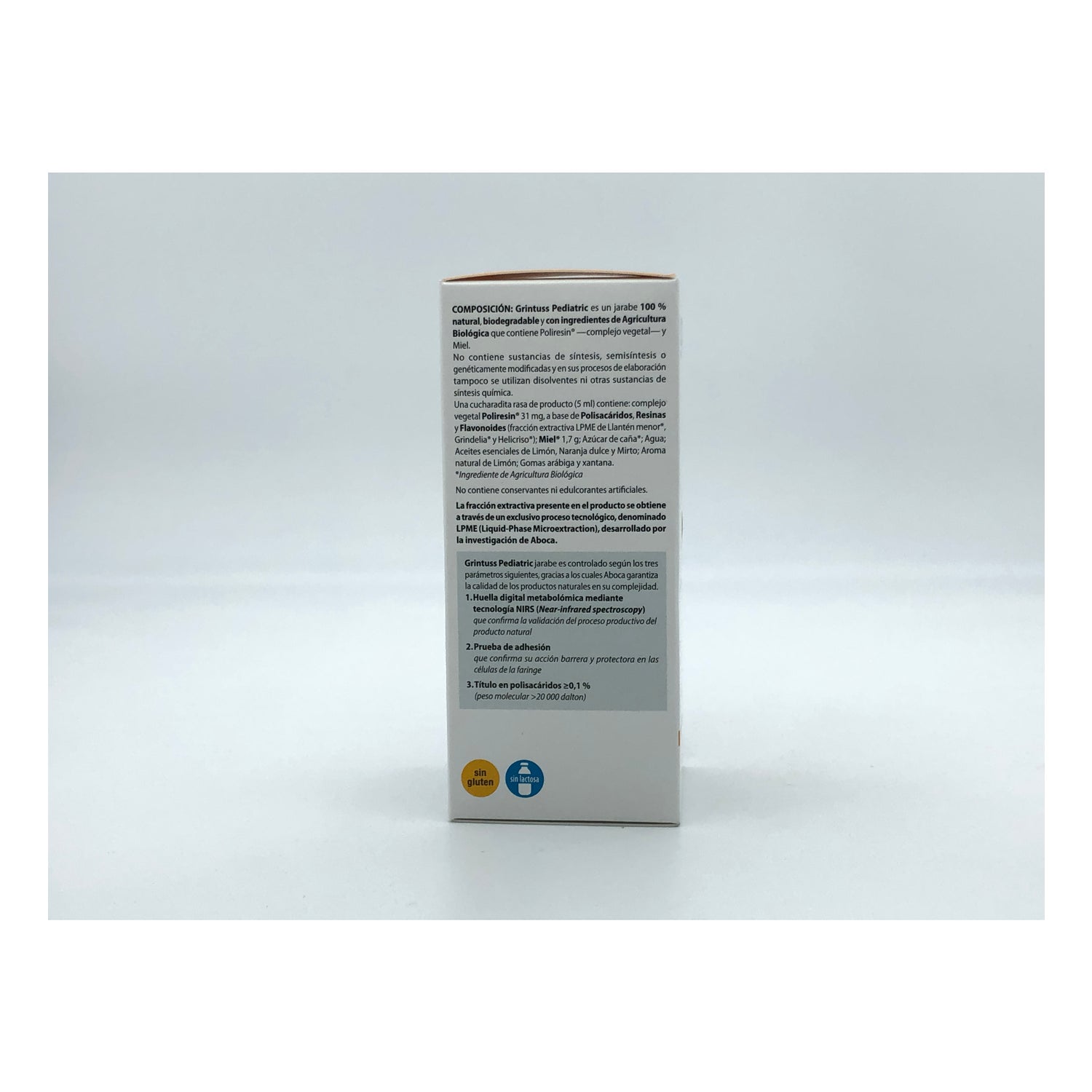 Miel*; Complejo molecular de Resinas, Polisacáridos y Flavonoides de Grindelia*, Llantén* y Helicriso (Poliresin®), azúcar de caña*, agua, aceites esenciales de: limón, naranjo dulce, mirto, aroma natural de limón, goma arábiga, goma xantana.