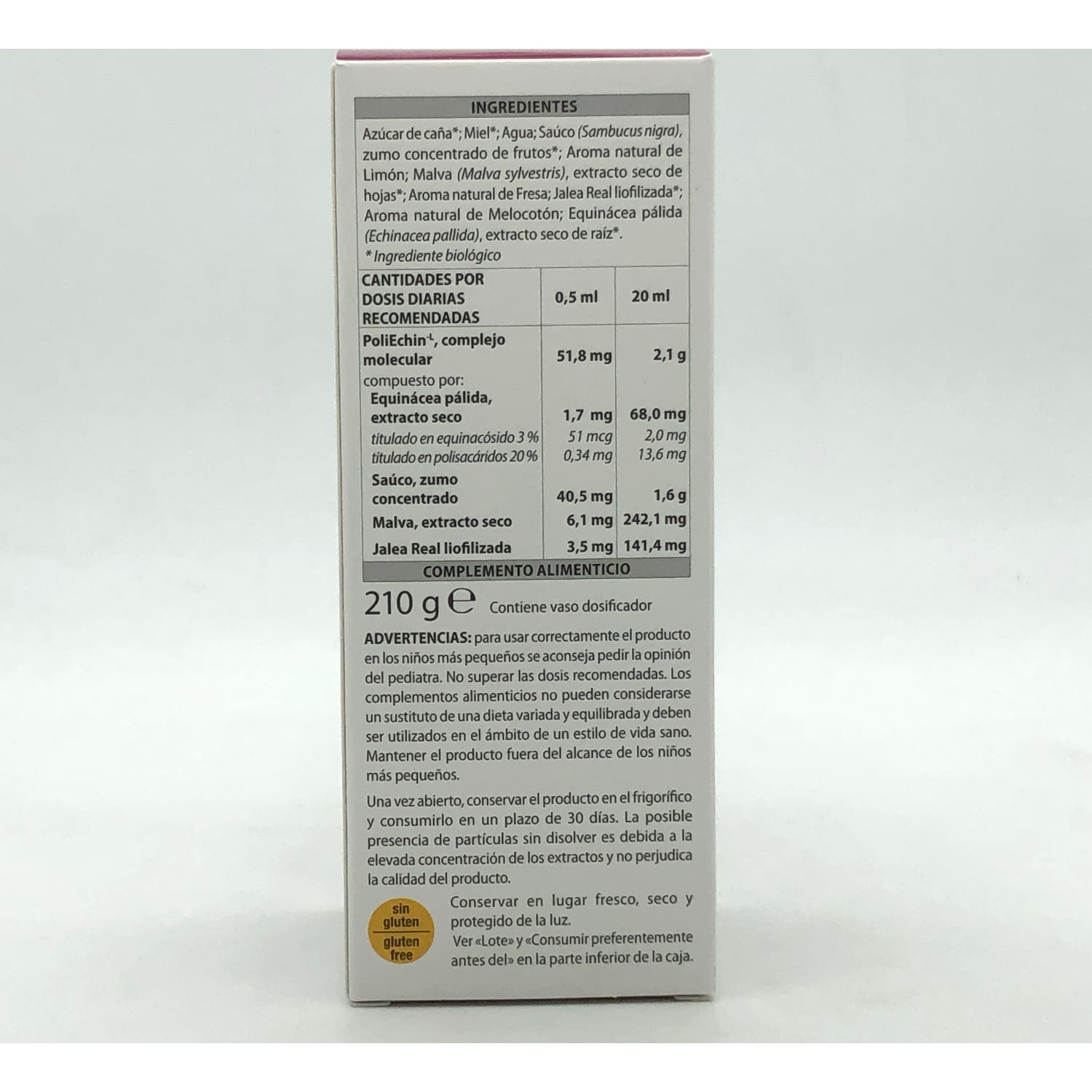 Azúcar de caña*; Miel*; Agua; Saúco (Sambucus nigra), zumo concentrado de frutos*; Aroma natural de Limón; Malva (Malva sylvestris), extracto seco de hojas*; Aroma natural de Fresa; Jalea Real liofilizada*; Aroma natural de Melocotón; Equinácea pálida (Echinacea pallida), extracto seco de raíz*.