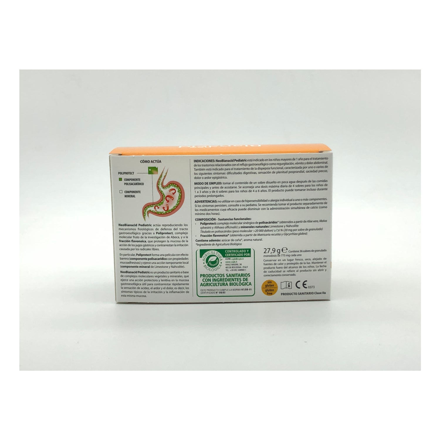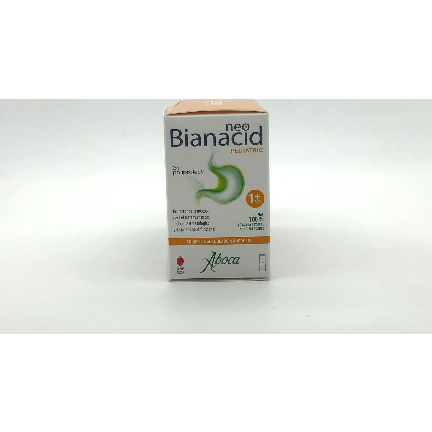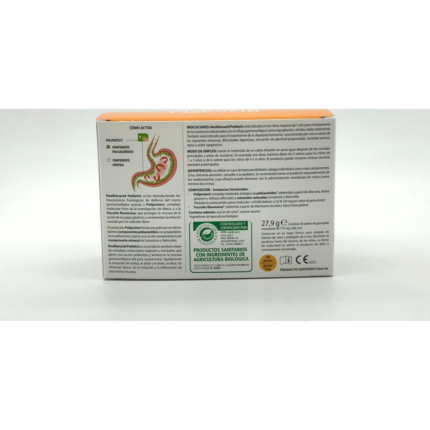 Aboca NeoBianacid Pediatric 36 sobres es un complemento alimenticio 100% natural que contribuye a proteger la mucosa gastroesofágica y ayuda a reducir la sensación de acidez, el ardor y el dolor provocada por la irritación e inflamación de esa mucosa.