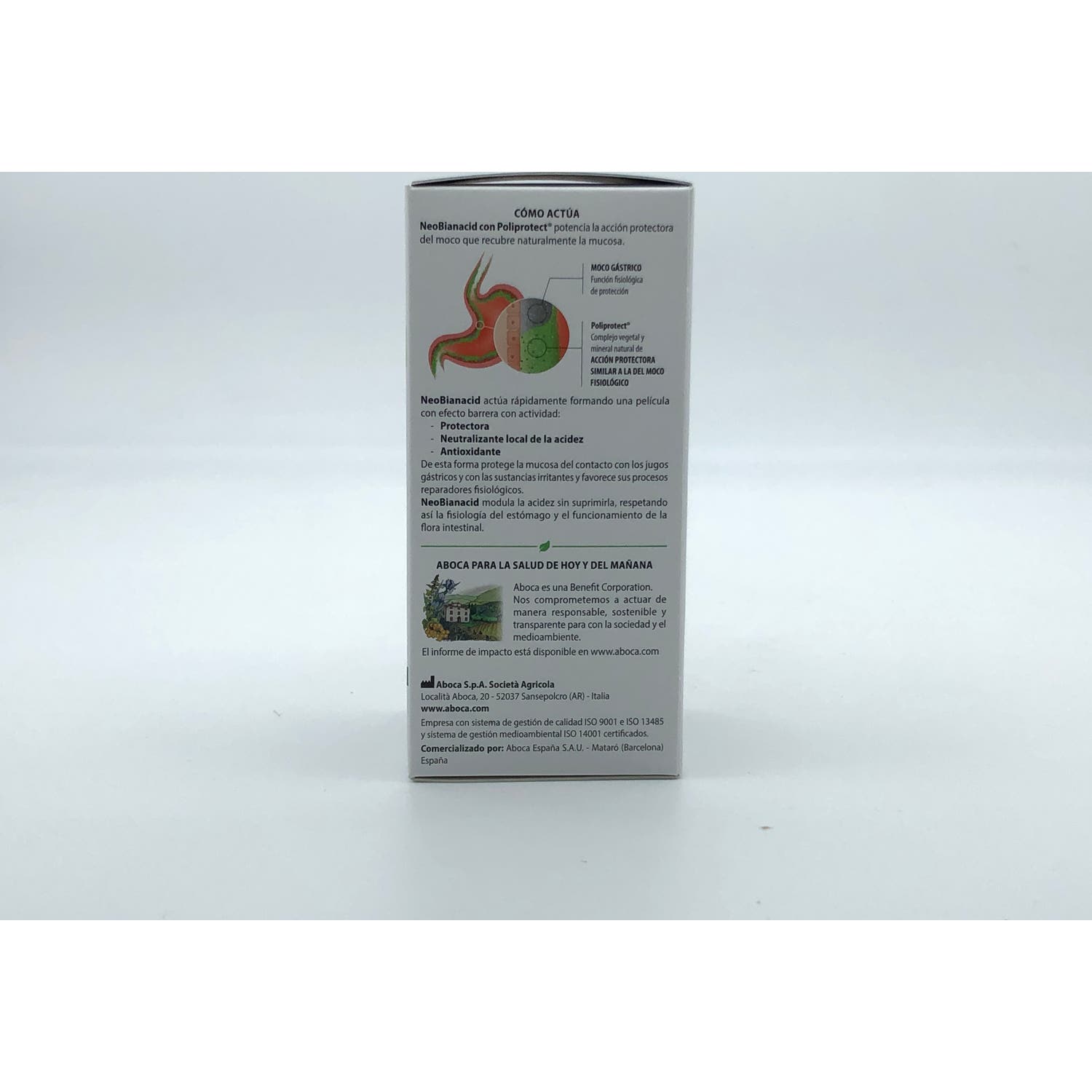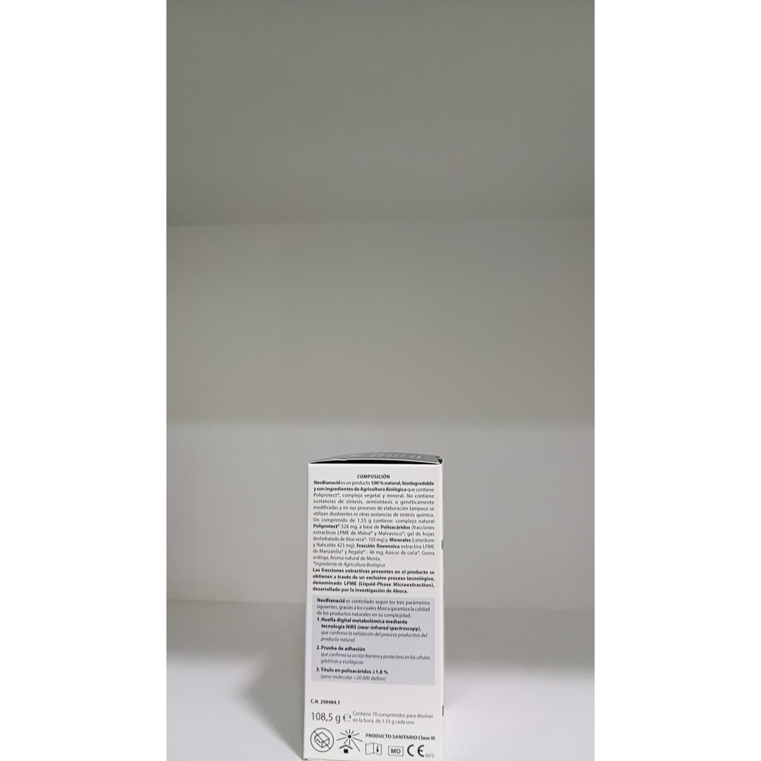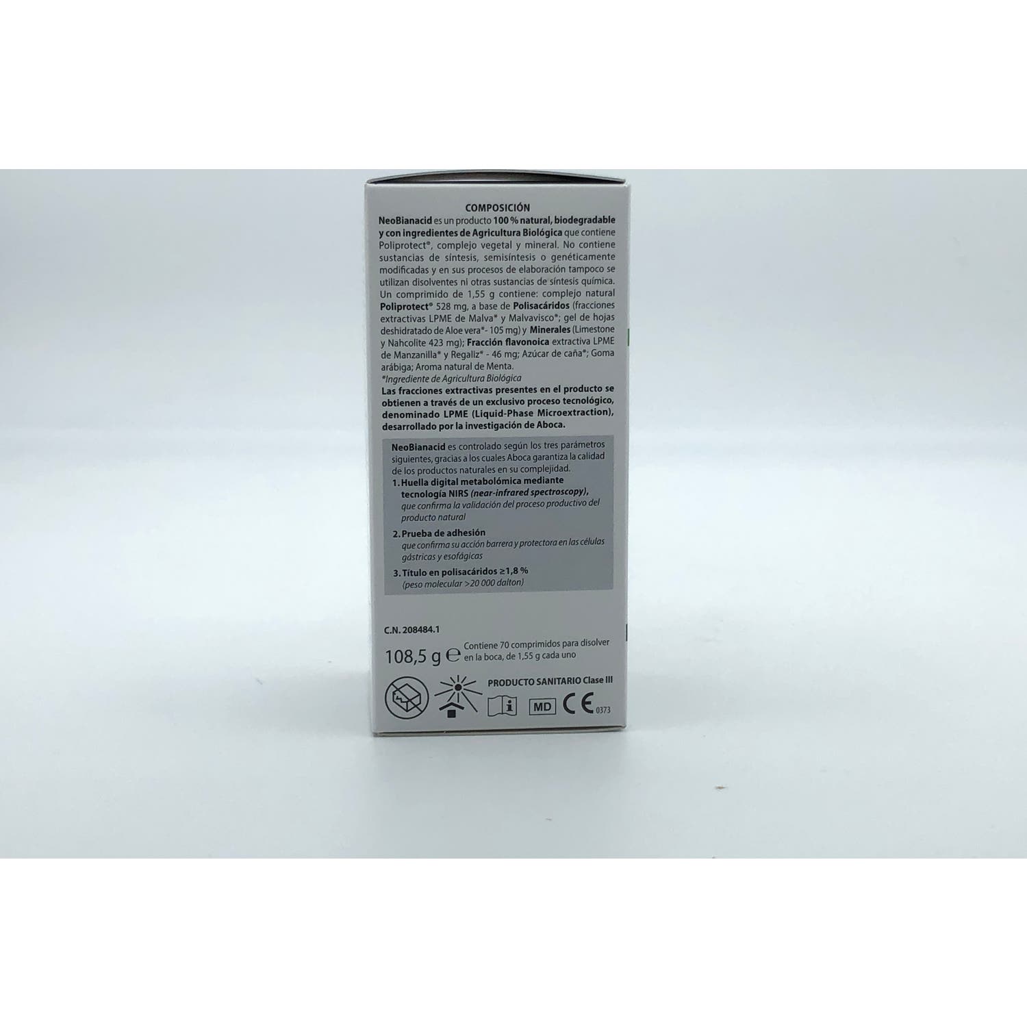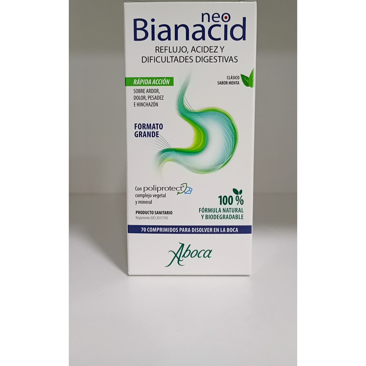 Aboca NeoBianacid Sabor Menta 70comp es un complemento alimenticio en comprimidos que contribuye a contrarrestar el ardor y la sensación de acidez. Se puede tomar en caso de trastornos con la acidez, como ardor, dolor, reflujo gastroesofágico y gastritis, ardor y pesadez.
