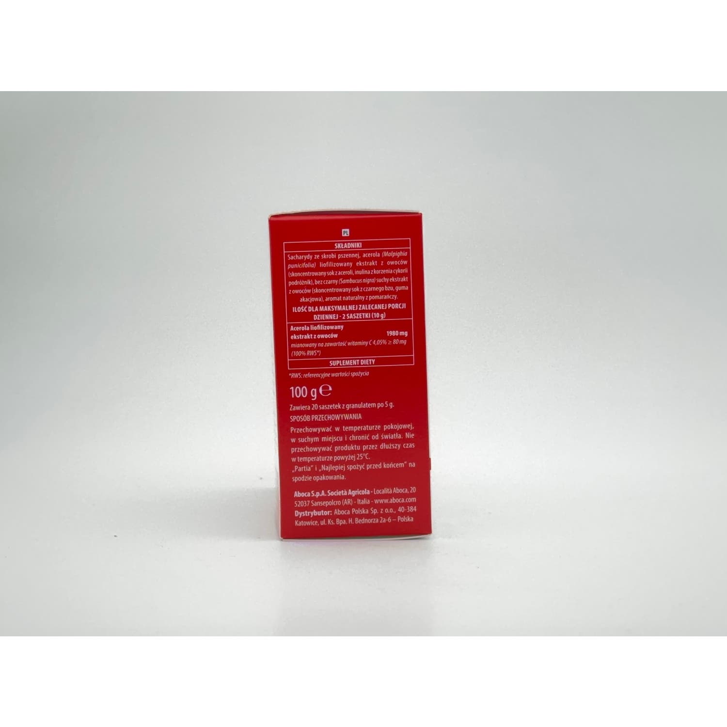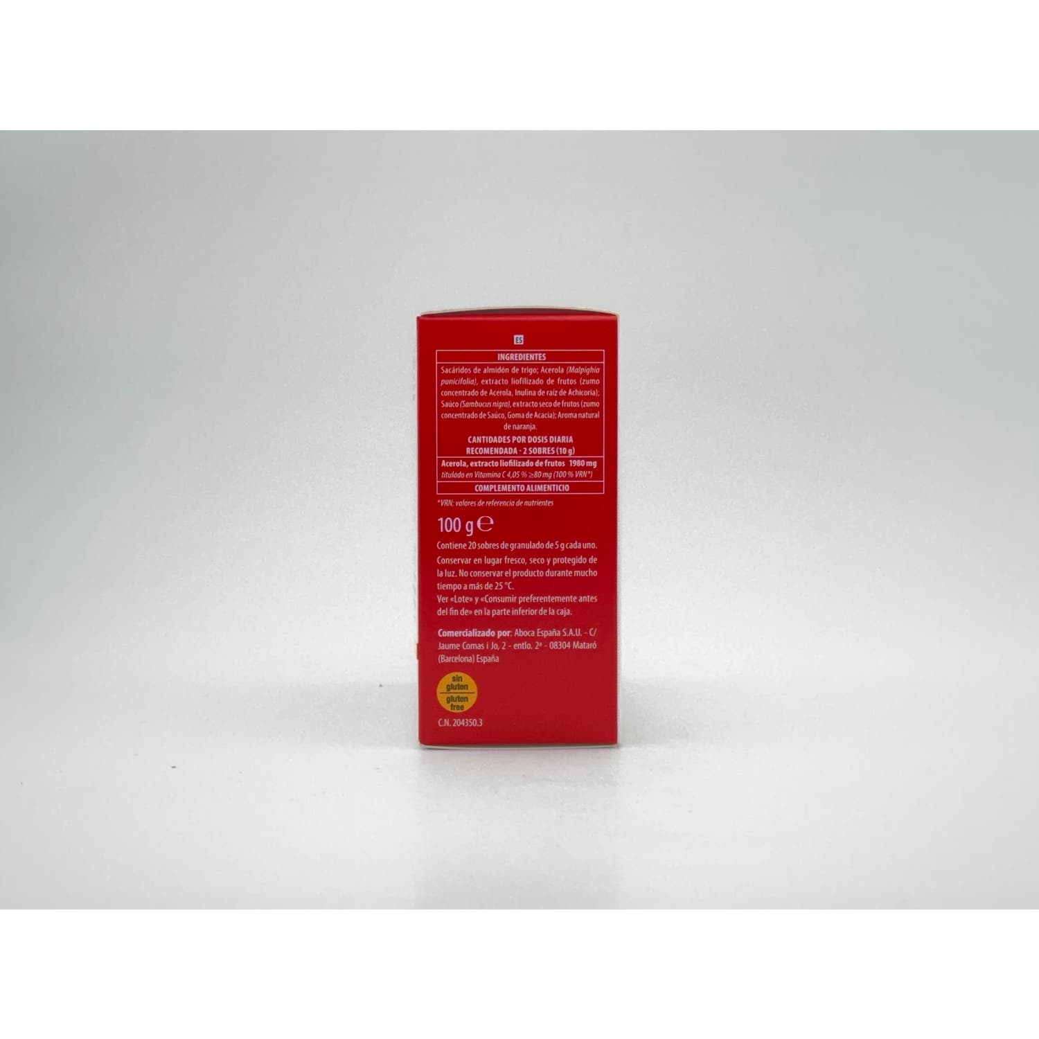 Sacáridos de almidón de trigo; Acerola (Malpighia punicifolia), extracto liofilizado de frutos (zumo concentrado de Acerola, Inulina de raíz de Achicoria); Saúco (Sambucus nigra), extracto seco de frutos (zumo concentrado de Saúco, Goma de Acacia); Aroma natural de naranja.
