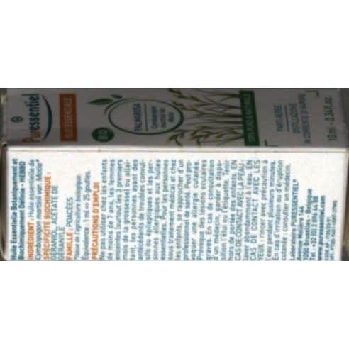 El aceite esencial de palmarosa bio Puressentiel es un aceite antibacteriano, antiviral, astringente y cicatrizante.