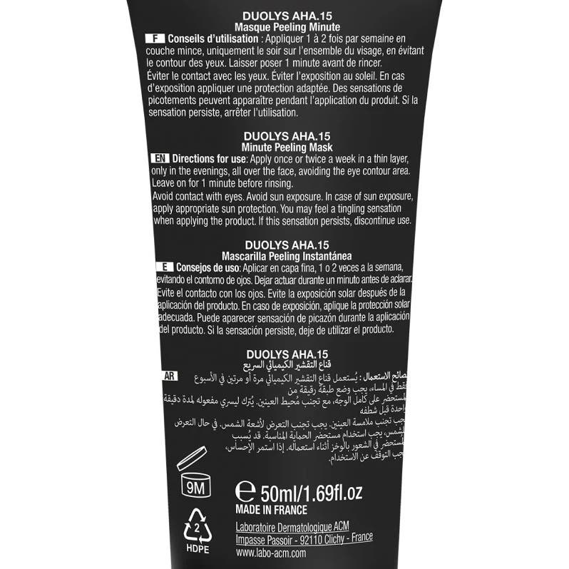 Acm Duolys AHA 15 Mascarilla Peeling Min 50ml es un innovador tratamiento facial que combina la eficacia de un 15% de AHA, incluyendo ácido glicólico y ácido láctico. Diseñada para ofrecer resultados visibles en un tiempo récord, esta mascarilla peeling transforma la piel en solo un minuto.
