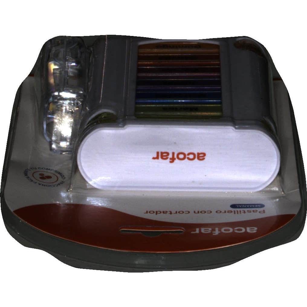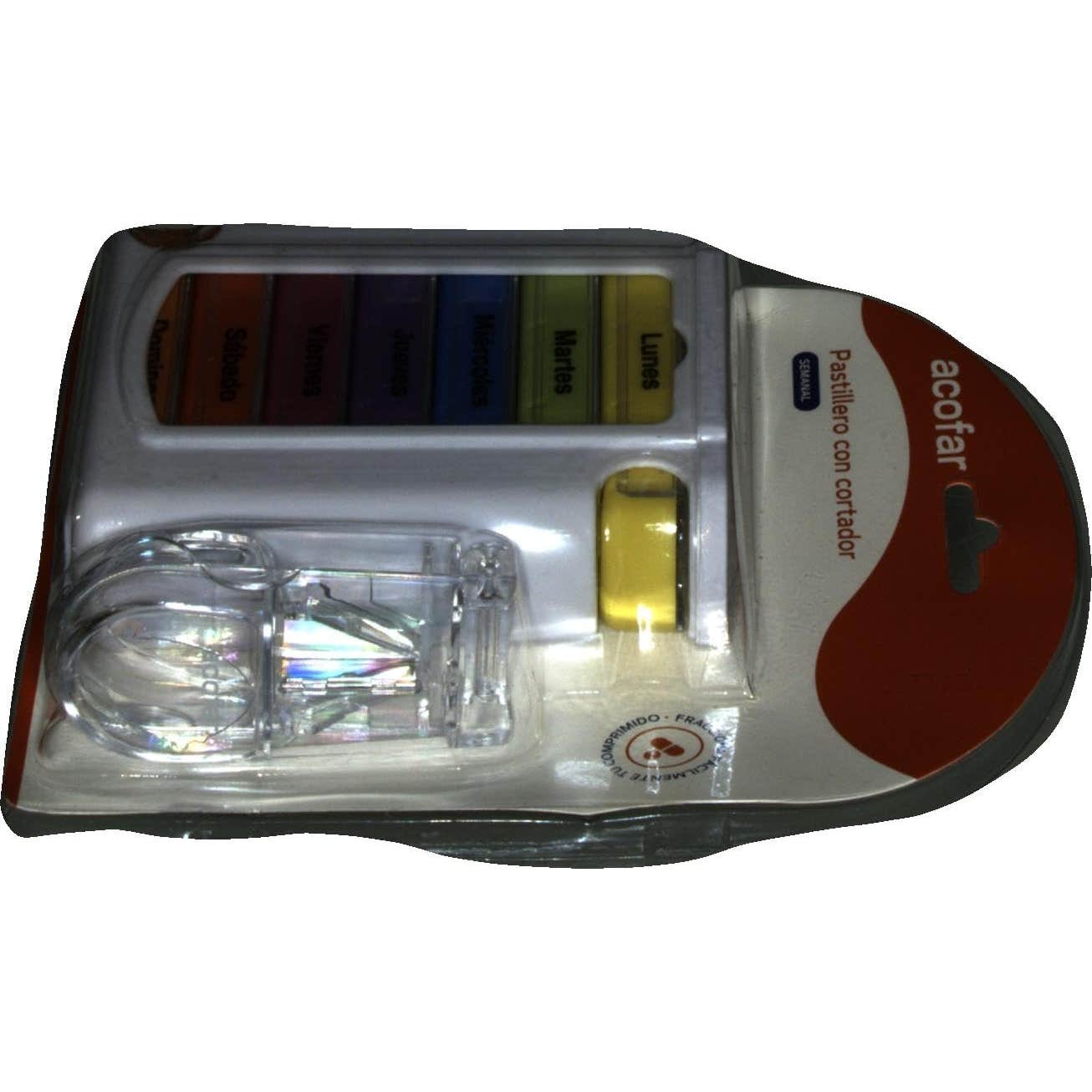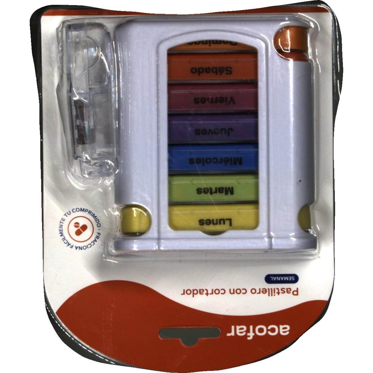 Acofar Pastillero Semanal con Cortador es un pastillero con 7 módulos de diferentes colores y con los días de la semana que colabora a controlar y regular la ingesta de medicamentos. Además, incluye un cortador para cortar los comprimidos de forma eficaz, limpia y segura.