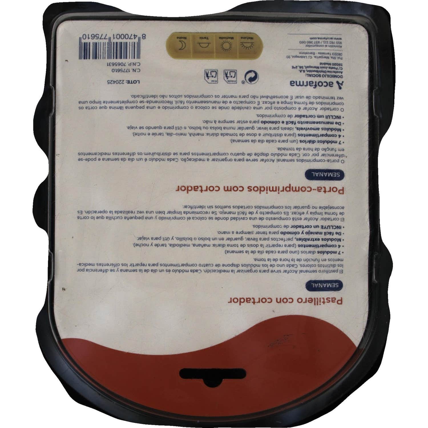 Cada uno de los módulos está dividido en 4 compartimentos. En total, tiene una capacidad para 28 dosis, lo que permite precisar también la hora del día en que tomar cada dosis.