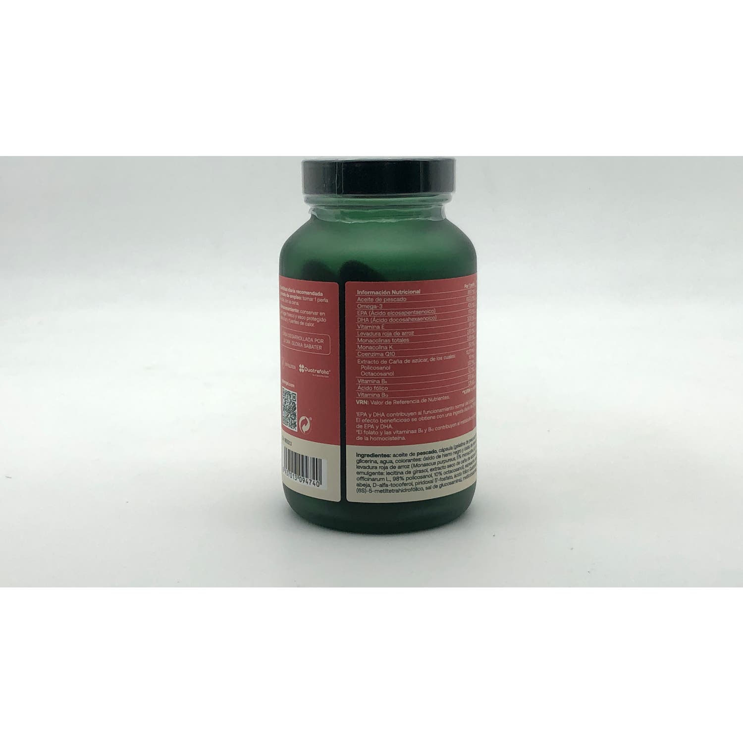 Aceite de pescado, cápsula (gelatina bovina, humectante: glicerina, agua, colorantes: óxido de hierro negro y óxido de hierro rojo), arroz de levadura roja (Monascus purpureus, 5 % monacolina K), coenzima Q10, emulgente: lecitina de girasol, extracto seco de caña de azúcar (Saccharum officinarum L., 98 % policosanol, 10% octacosanol), espesante: cera amarilla de abeja, D-alfa-tocoferol, piridoxal 5?-fosfato, ácido fólico Quatrefolic ® (ácido (6S)-5-metiltetrahidrofólico, sal de glucosamina), metilcobalamina.Por 1 perla: Aceite de pescado 850 mg Omega 3 637,5 mg - EPA (Ácido eicosapentaenoico) 425 mg - DHA (Ácido docosahexaenoico) 170 mg Vitamina E 3,35 mg Levadura de arroz rojo 58 mg Monacolinas totales 2,9 mg Monacolina K 2,69 mg Coenzima Q10 50 mg Extracto de Caña de azúcar 10,20 mg Vitamina B6: 0,7 mg Ácido fólico: 200 mcg Vitamina B12: 1,25 MCG