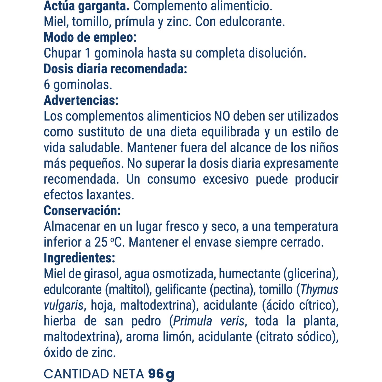 Complemento alimenticio a base de miel, tomillo, prímula y zinc.