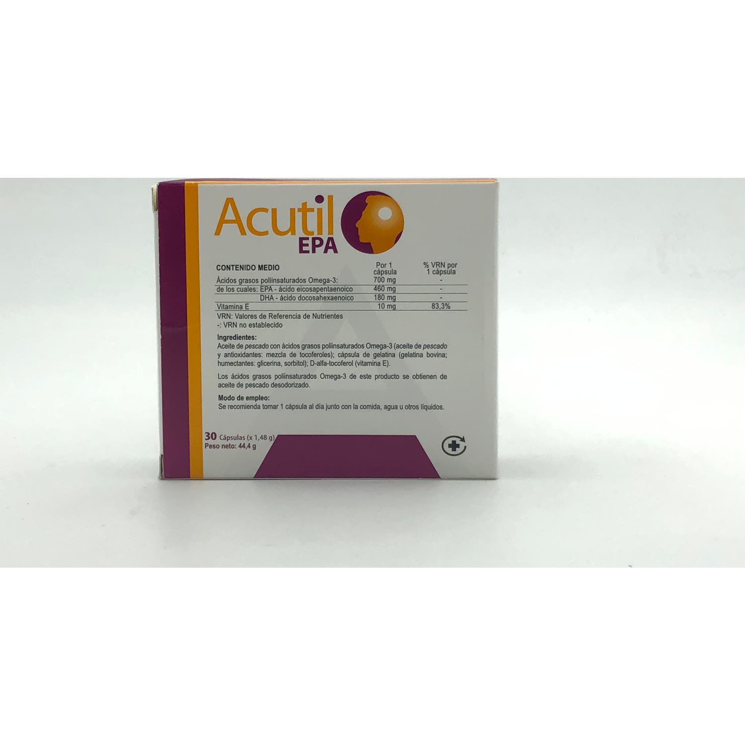 Acutil Epa es un complemento alimenticio rico en ácidos grasos Omega-3 y en vitamina E. Este complemento alimenticio te ayudará a mantener las funciones de tu organismo y contribuir a los procesos celulares y cognitivos.
