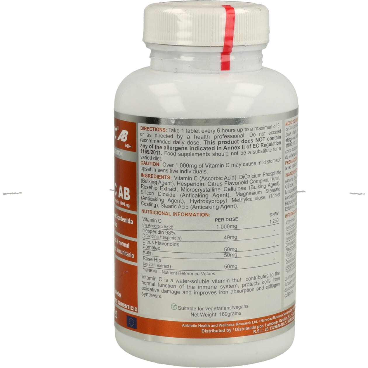 Airbiotic Vit C AB Complex 1.000 Mg Lib. Sostenida 120 Tabletas es un suplemento que aporta 1000 mg de vitamina C, junto con niveles relevantes de bioflavonoides (como hesperidina y rutina) y un extracto concentrado de escaramujo.