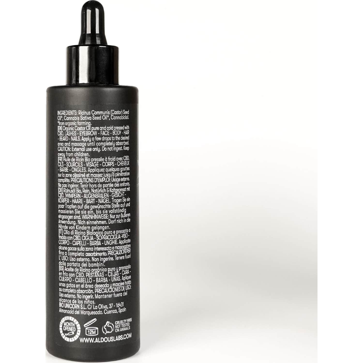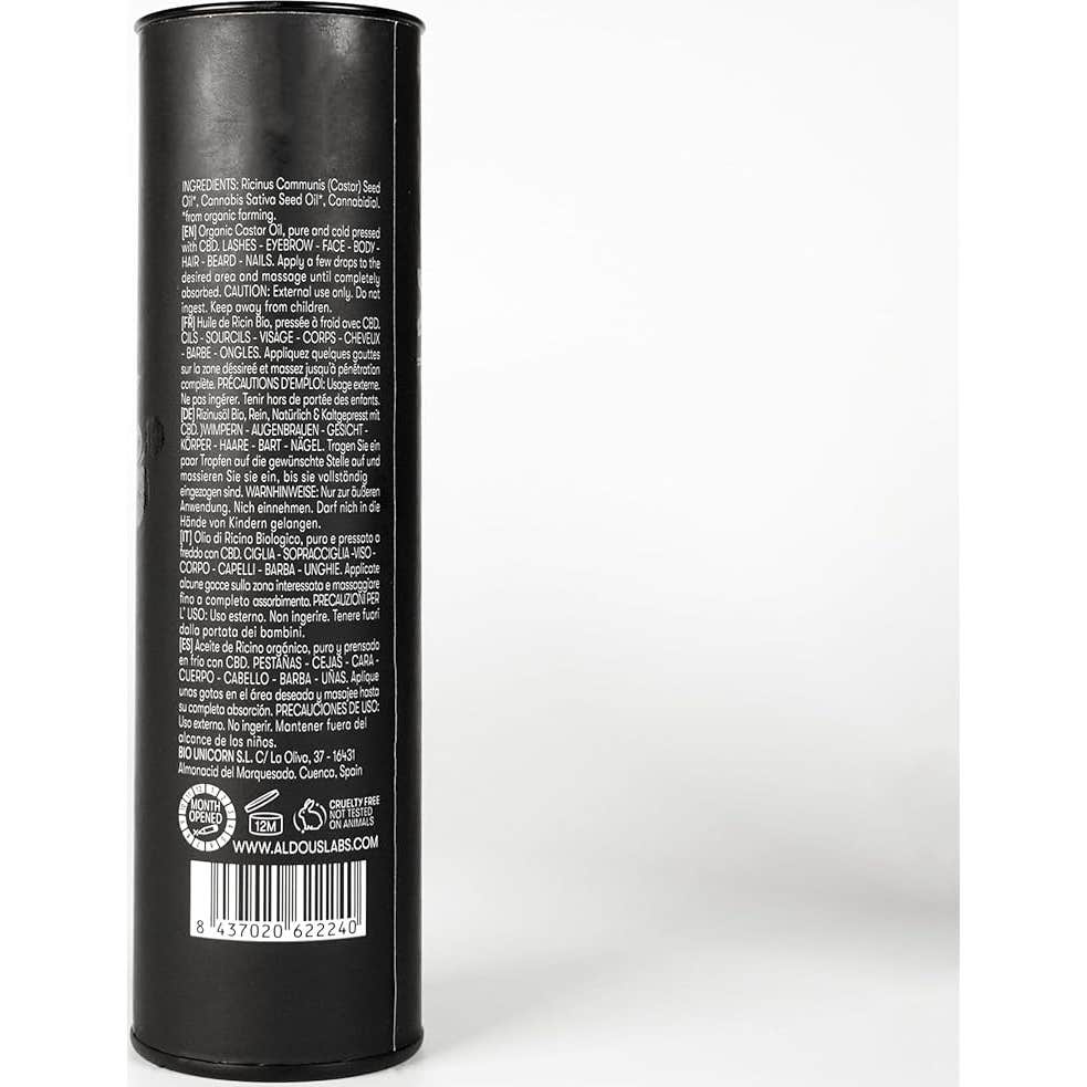 Aldous Labs Aceite de Ricino enriquecido con CBD 100ml es un aceite vegetal que nutre en profundidad la piel. El aceite de ricino nutre y favorece el normal crecimiento de cejas, barba y uñas.