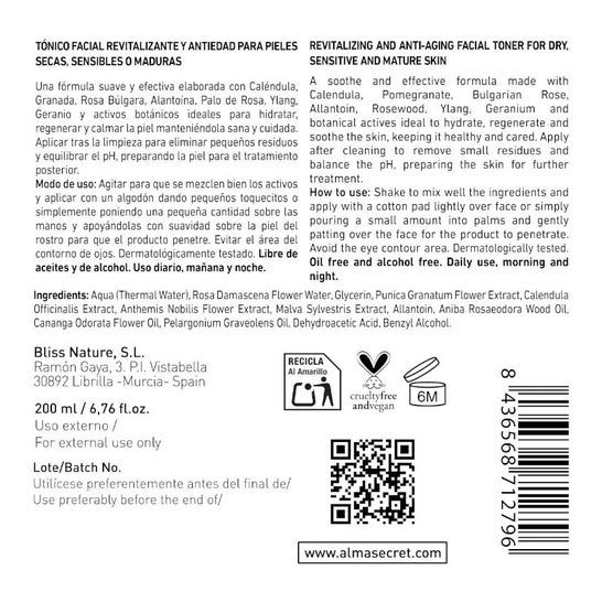 Alma Secret Facial Toner Revitalizante Antiedad Caléndula & Granada 200ml es un tónico facial que contribuye a: