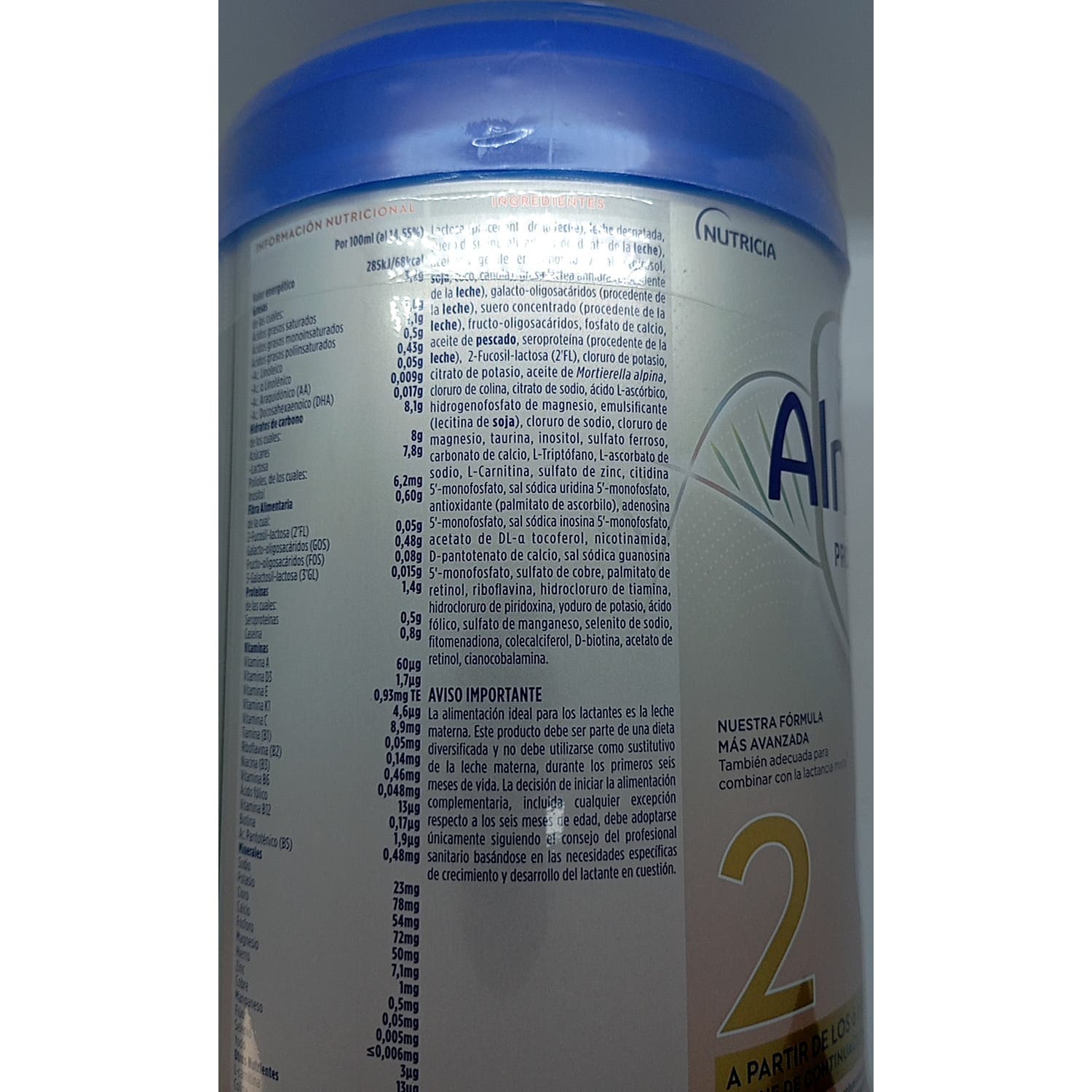 Lactosa (procedente de la leche), leche desnatada, suero desmineralizado (procedente de la leche), aceites vegetales (cánola, girasol, coco, girasol alto oleico), grasa láctea anhidra (procedente de la leche), galacto-oligosacáridos (procedentes de la leche), suero concentrado (procedente de la leche), fructo-oligosacáridos, fosfato de calcio, aceite de pescado, seroproteína (procedente de la leche), 2-Fucosil-lactosa, cloruro de potasio, aceite de Mortierella alpina, cloruro de colina, citrato de sodio, ácido L-ascórbico, hidrogenofosfato de magnesio, emulsificante (lecitina de soja), cloruro de sodio, cloruro de magnesio, taurina, inositol, sulfato ferroso, carbonato de calcio, L-triptófano, L-ascorbato de sodio, L-Carnitina, sulfato de zinc, citidina 5-monofosfato, sal sódica uridina 5-monofosfato, antioxidantre (palmitato de ascorbilo), adenosina 5- monofosfato, sal sódica inosina 5-monofosfato, acetato de DL-α tocoferol, nicotinamida, D-pantotenato de calcio, sal sódica guanosina 5-monofosfato, sulfato de cobre, palmitato de retinol, riboflavina, hidrocloruro de tiamina, hidrocloruro de piridoxina, yoduro de potasio, ácido fólico, sulfato de manganeso, selenito de sodio, fitomenadiona, colecalciferol, D-biotina, acetato de retinol, cianocobalamina.